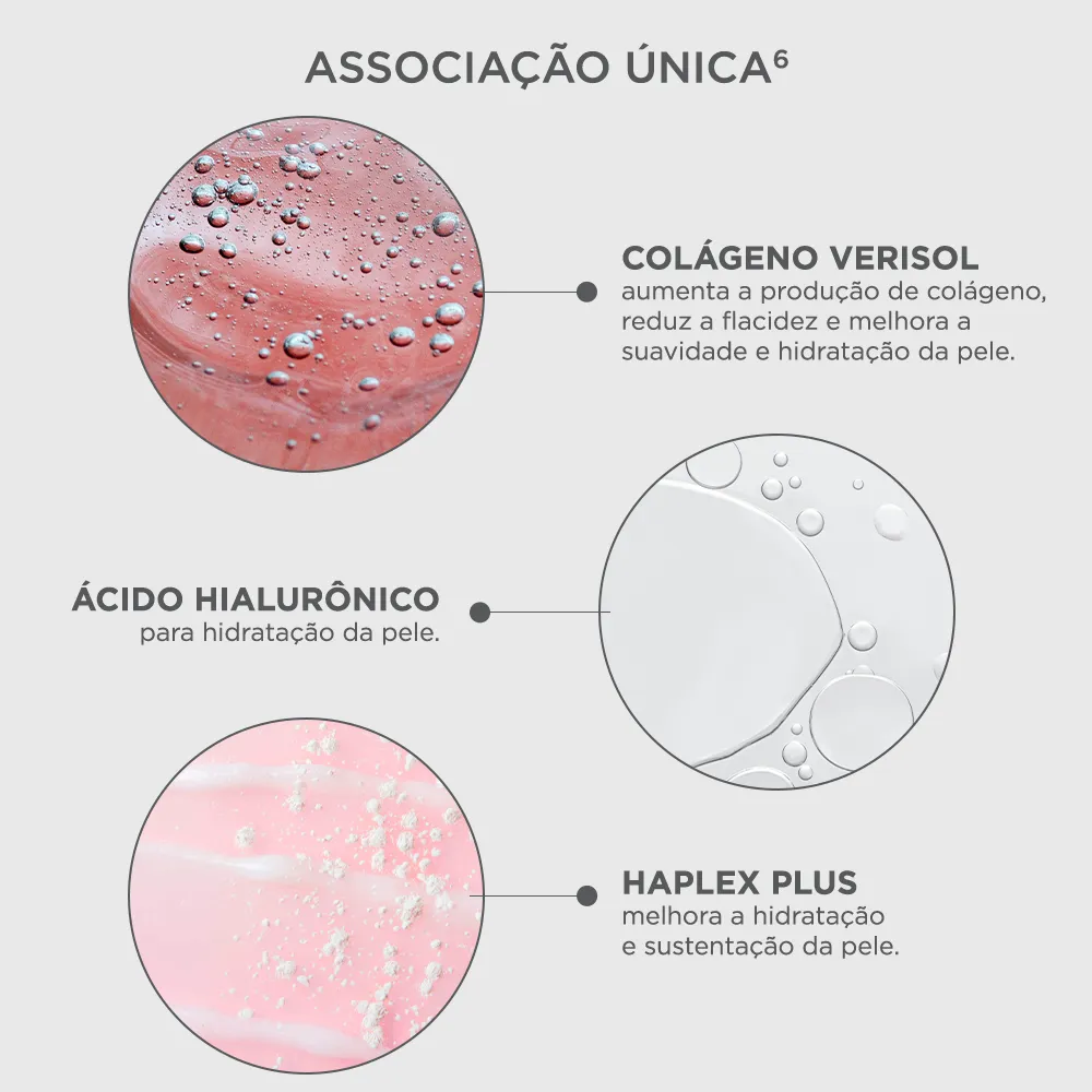 - Fortalece a estrutura da pele com a combinação de colágeno VERISOL e ácido hialurônico.