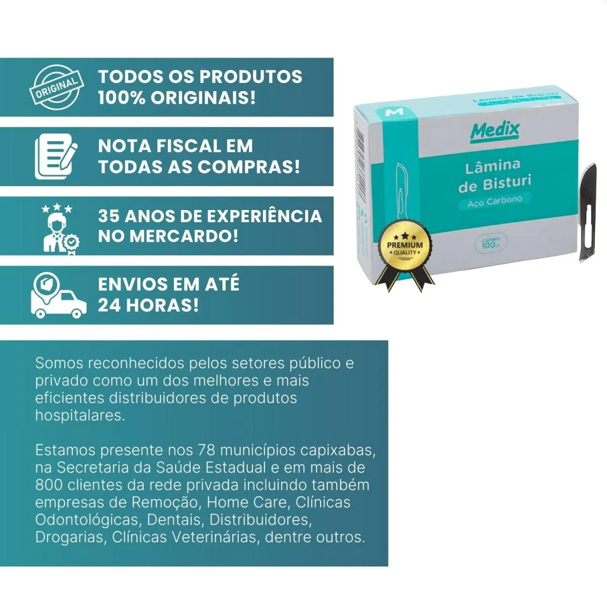 Desde 1990 atuamos com foco em licitações públicas para atendimento a hospitais e clínicas médicas do Espírito Santo. Somos reconhecidos pelos setores público e privado como um dos mais eficientes distribuidores de produtos hospitalares, estando presentes nos 78 municípios capixabas, na Secretaria da Saúde Estadual e em mais de 800 clientes da rede privada, incluindo empresas de Remoção, Home Care, Clínicas Odontológicas, Dentais, Distribuidores, Drogarias e Clínicas Veterinárias.