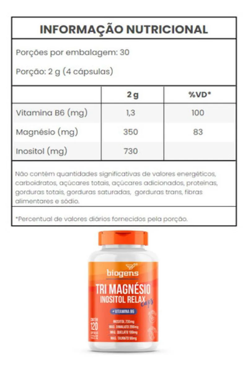 INGREDIENTES: Inositol, Malato de magnésio, Bisglicinato de magnésio, Taurato de magnésio e Cloridrato de piridoxina. Diluente: Amido de milho. Estabilizante: Celulose microcristalina. Antiumectante: Dióxido de silício e estearato de magnésio. Composição da cápsula: Água purificada, gelatina e umectante glicerina. ALÉRGICOS: PODE CONTER CRUSTÁCEOS. NÃO CONTÉM GLÚTEN.