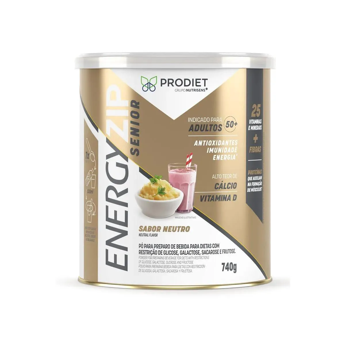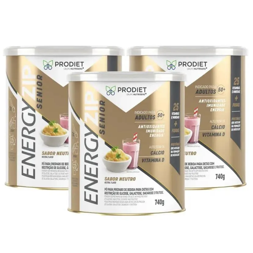 Suplemento nutricional para adultos e idosos com proteínas, fibras, vitaminas e minerais. Energyzip Sênior Sabor Neutro - Lata 740 gr Indicado para pessoas acima de 50 anos, ou para quem apresenta ingestão alimentar reduzida, necessidades nutricionais aumentadas ou busca reforço nutricional no dia a dia. O sabor neutro permite fácil inclusão em diferentes preparações, como bebidas, sopas e receitas. Cada embalagem contém 740g do Suplemento Alimentar Energyzip Senior em pó, pronto para preparo. O produto é fonte de proteínas de alto valor biológico, carboidratos, fibras, vitaminas A, C, D, E, K e complexo B, além de minerais como cálcio, ferro, zinco, magnésio e selênio. Esses nutrientes auxiliam na manutenção da força muscular, da imunidade e da saúde óssea. Pode ser utilizado como complemento entre as refeições ou conforme orientação médica ou nutricional.