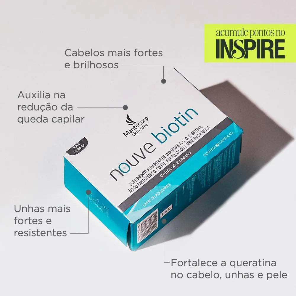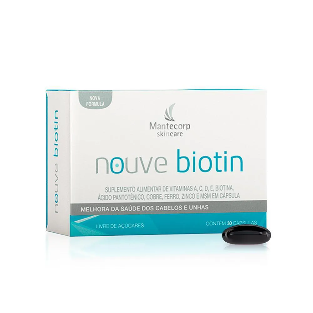 O Nouve Biotin é um nutricosmético composto por Biotina, vitaminas e minerais, apresentado em um kit com três caixas de 30 cápsulas cada. É um suplemento livre de açúcares, calorias e lactose, sem ingredientes de origem animal, petrolatos e parabenos, e indicado por dermatologistas. Seu objetivo principal é fornecer nutrientes essenciais para a saúde e fortalecimento das unhas e cabelos, sendo de fácil consumo.