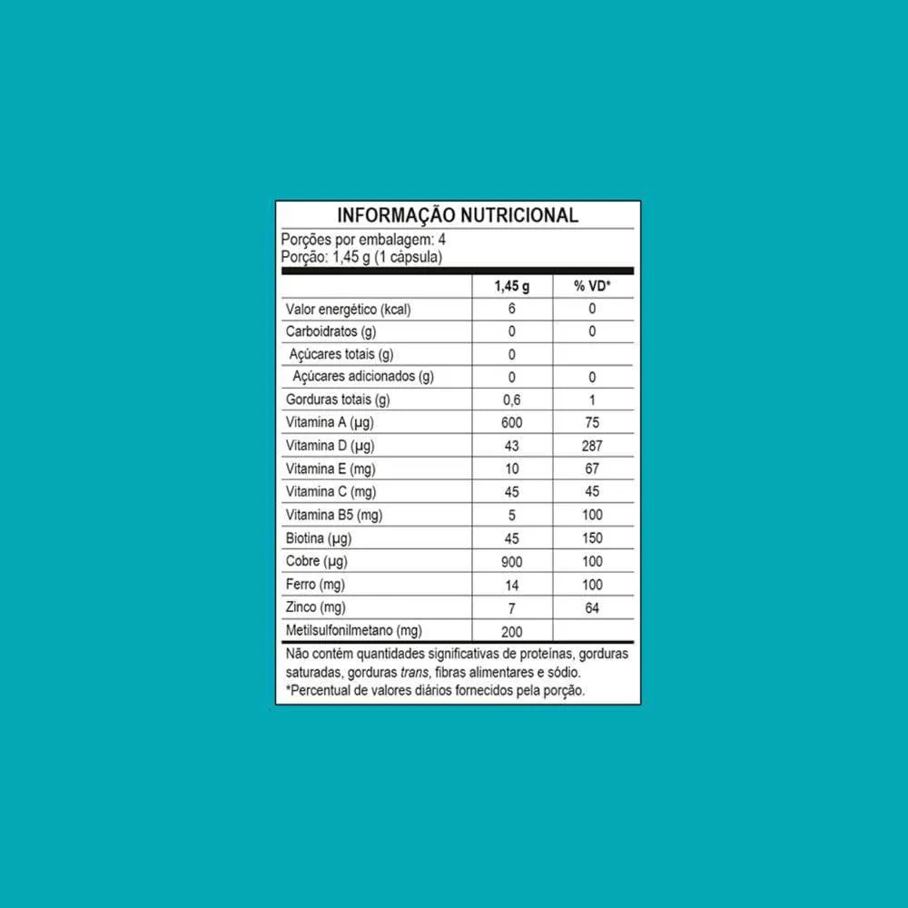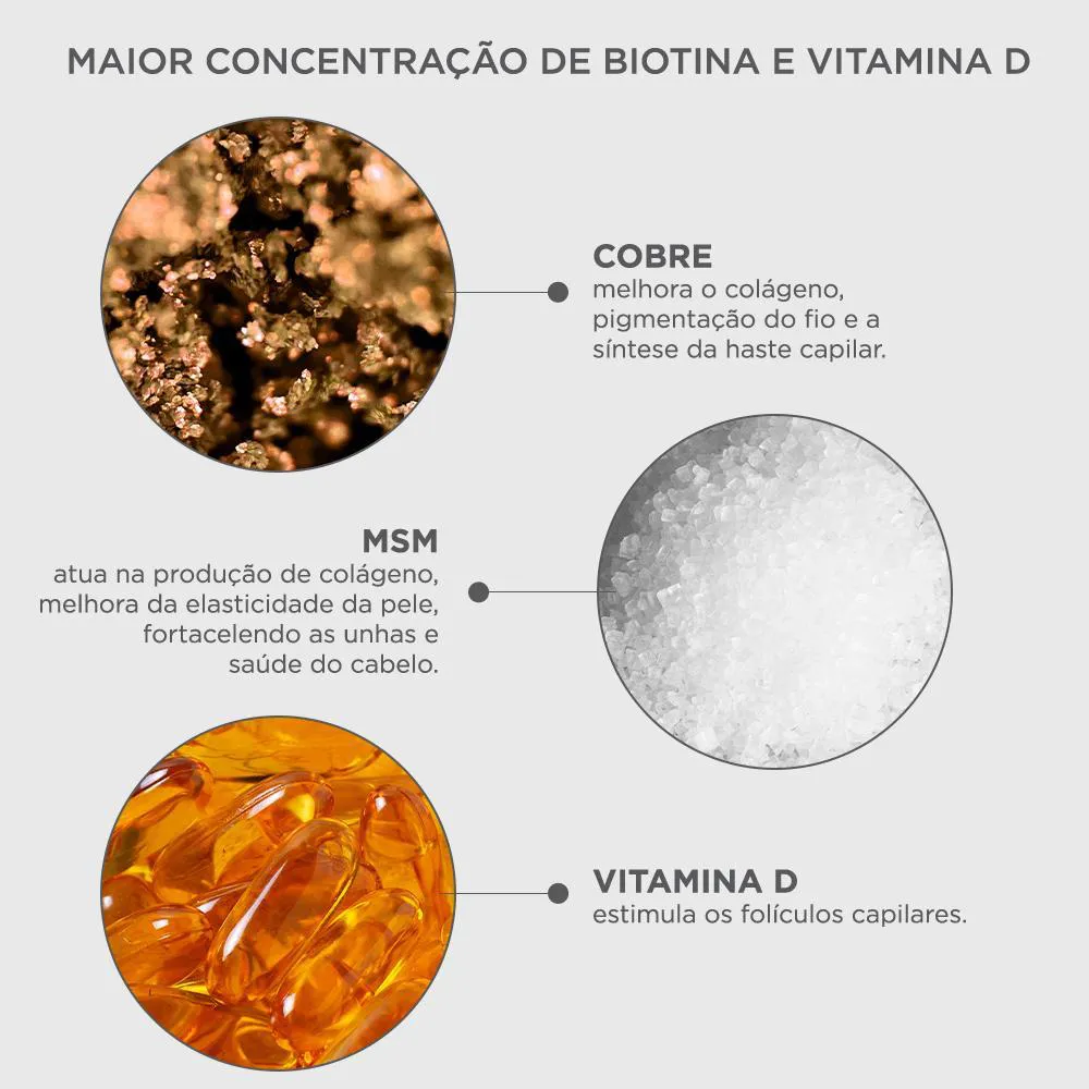 - Suplementação nutricional com biotina, vitaminas e minerais essenciais para a beleza capilar e unhas.