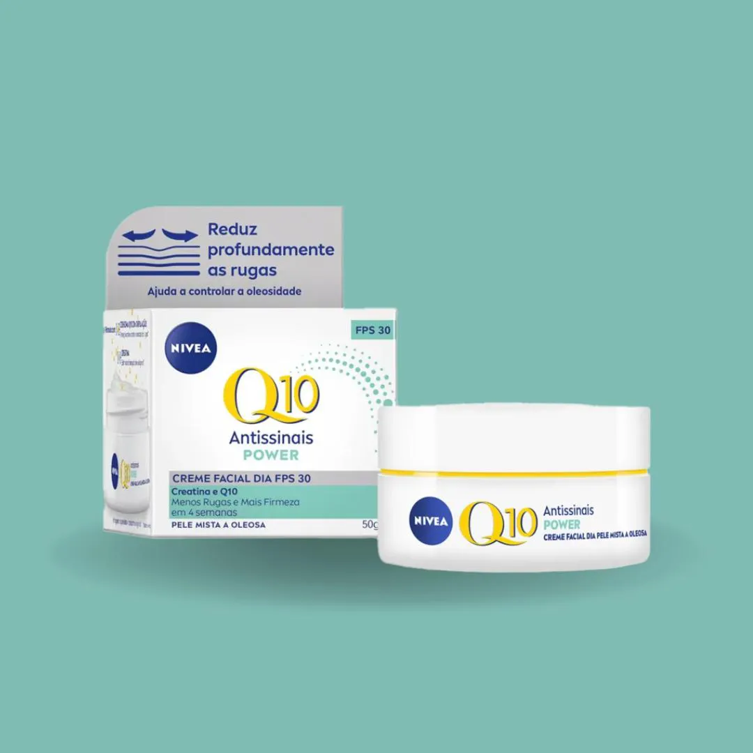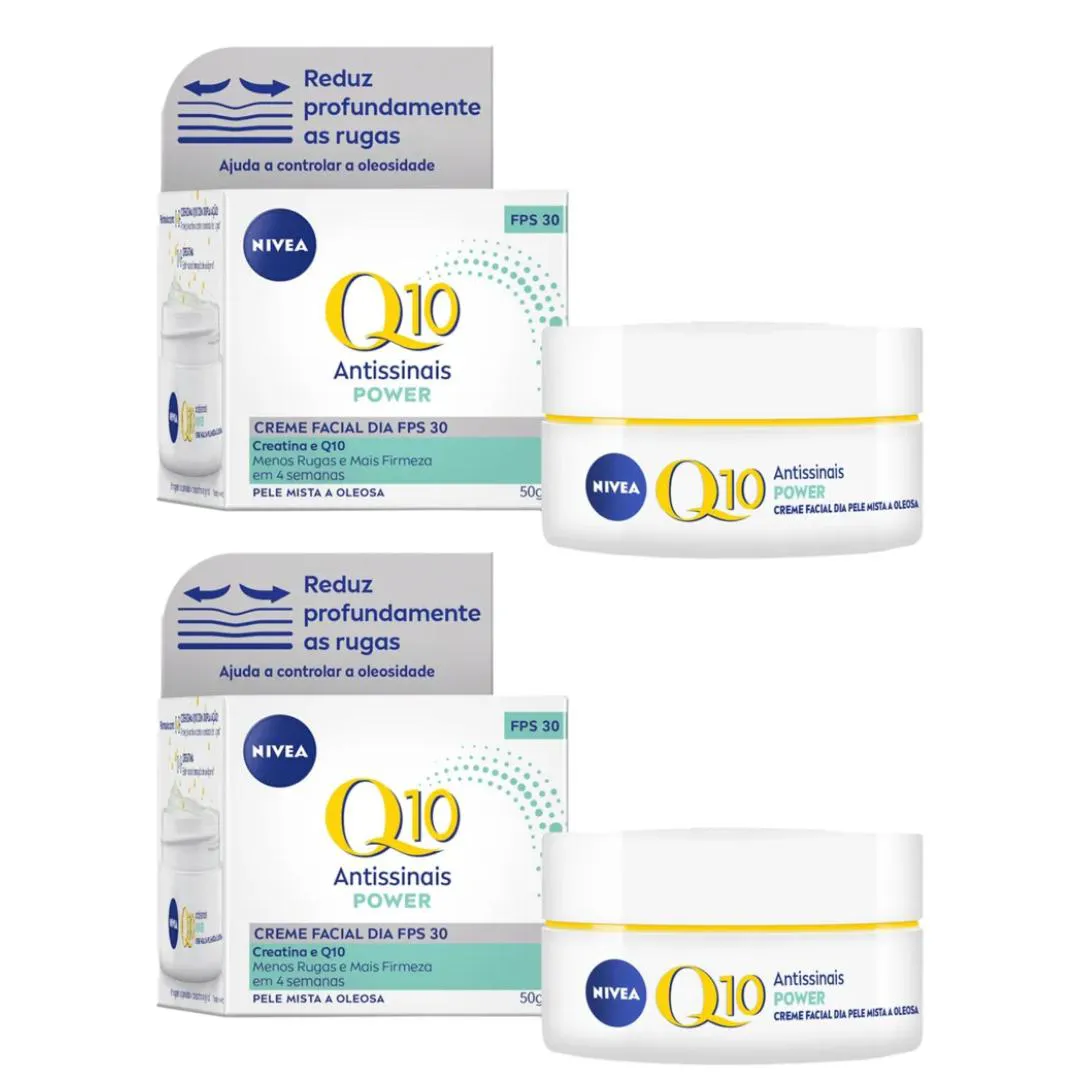 Kit C2 Creme Facial Q10 Power pele oleosa Dia 52g – Nívea Neste produto está sendo enviado 2 unidades do Creme Facial Q10 Power Pele Oleosa Dia, 52g cada. Creme Facial Q10 Pele Oleosa Antissinais Dia 52g – Nívea Creme desenvolvido para hidratação e rejuvenescimento facial, ideal para pele oleosa, uso diurno. Reduz profundamente as rugas e ajuda a controlar a oleosidade da pele. Com coenzima Q10 100% pura, idêntica à da pele, este creme promove proteção antioxidante, o que resguarda as células da pele contra os danos de radicais livres e fatores externos. A creatina, também presente na fórmula, estimula a produção de colágeno, deixando a pele mais firme. A combinação entre Q10 e creatina age efetivamente contra linhas e rugas, deixando a pele com aparência mais jovem. Além de melhorar a elasticidade da pele em 4 semanas, sua fórmula leve e de rápida absorção apresenta sensação de toque seco, controlando visivelmente o brilho da pele. Não comedogênico, ou seja, não obstrui os poros. Benefícios: Reduz profundamente as rugas. Ajuda a controlar a oleosidade. Com Q10 e Creatina. Com FPS 30, protege contra os raios UVA/UVB. Rápida absorção. Proteção antioxidante e combate às rugas. Para peles mistas e oleosas. Melhora a elasticidade da pele em 4 semanas.