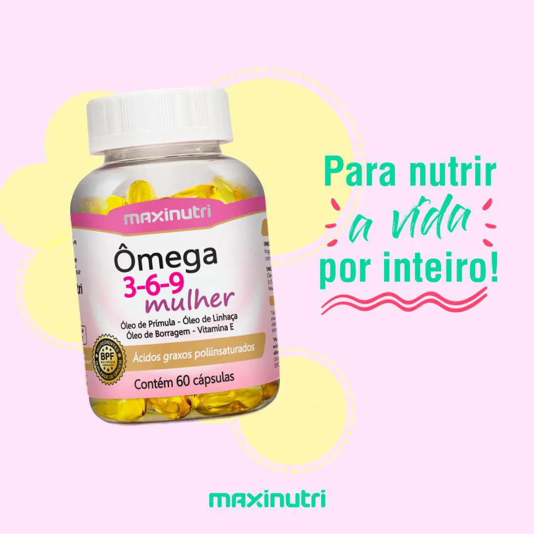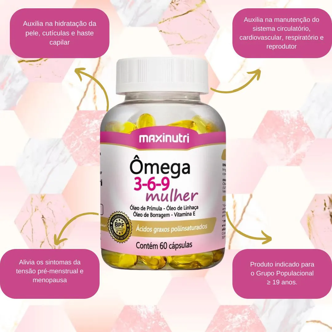 Suplemento alimentar em cápsulas, à base de Óleo de Prímula, Óleo de Linhaça, Óleo de Borragem e vitamina e, nutrientes essenciais para o bom funcionamento do organismo feminino.