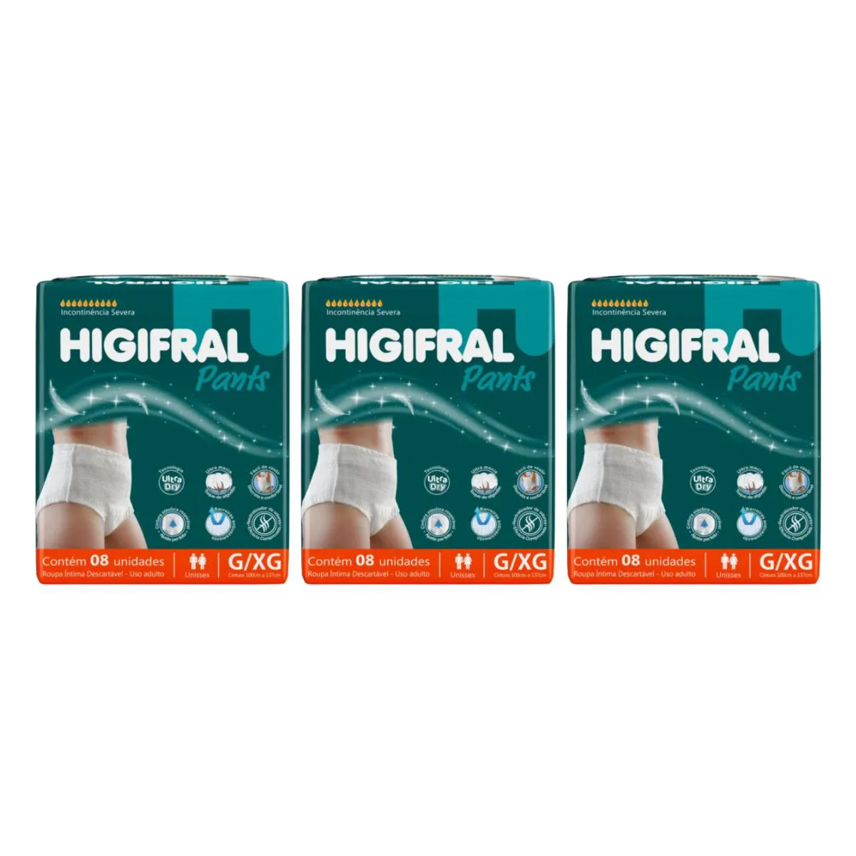 Kit C3 Roupa Íntima Descartável Pants - HigifralRoupa Íntima unissex G/XG C/08 Incontinência Severa – HigifralFralda Geriátrica/Adulto Descartável UnissexNeste produto está sendo enviado 3 (três) pacotes da Fralda Geriátrica tamanho G/XG, com 8 unidades cada.Tamanho: G/XG (cinturas entre 104cm e 137cm).