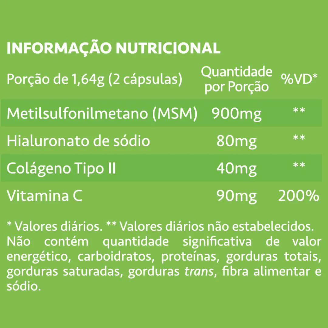 Metilsulfonilmetano (msm), hialuronato de sódio (fonte de ácido hialurônico), vitamina c, colágeno de frango com colágeno tipo ii não desnaturado, excipiente: silicato de magnésio, cápsula: gelatina, corante: dióxido de titânio, amarelo 6, vermelho 40, azorrubina e azul brilhante.