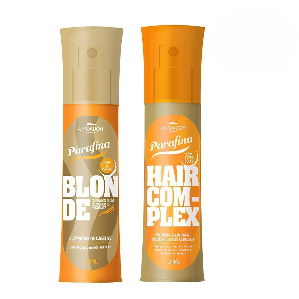 O Kit Cabelo Parafina Bronze Hair Complex + Blonde Clareador é um conjunto de produtos capilares composto por um protetor solar para Cabelos e um Clareador Solar, desenvolvido especificamente para cuidado e embelezamento capilar.