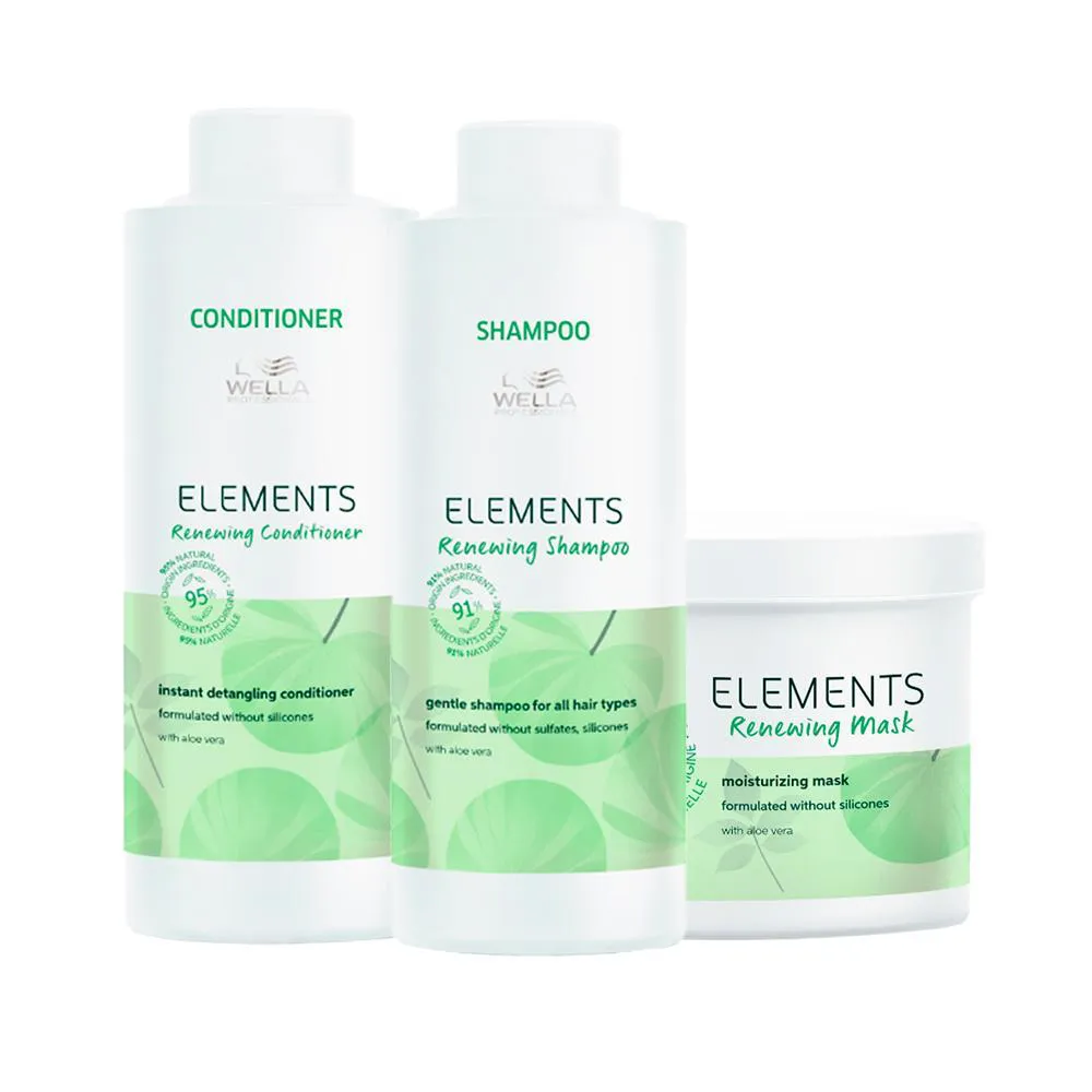 A Linha Wella Professionals Elements Renewing criada para todos os tipos de cabelo. Com uma fórmula rica em ativos naturais e orgânicos, ele repõe e protege os nutrientes dos fios, proporcionando força e vitalidade. Com o Kit Wella Professionals Elements Renewing você limpa e condiciona, reparando intensamente e deixando um aroma delicioso, agindo profundamente nas fibras capilares sem agredi-las. Além disso, também hidrata, mas sem deixar com aspecto pesado e fragrância exclusiva, inspirada nas árvores da Amazônia. Garanta um cabelo limpo e hidratado, com força e proteção, além de um amora delicioso! * RESULTADO: Brilho, Hidratação * SUGESTÕES DE USO: Shampoo1.Aplique uma quantidade pequena nos cabelos úmidos e massageie.2.Enxágue completamente.3.Repita se necessário. Condicionador1.Aplicar no comprimento e pontas, aguardar 30s.2.Enxague.3.Para melhores resultados, utilizar juntamente com shampoo Elements. Máscara1.Aplique nos fios limpos e úmidos.2.Deixe agir de 3 a 5 minutos.3.Enxágue completamente. * OBSERVAÇÕES: Imagem Meramente Ilustrativa * ITENS INCLUSOS: 1 Wella Professionals Elements Renewing Shampoo 1000 ml 1 Wella Professionals Elements Renewing máscara de Hidratação 1000 ml 1 Wella Professionals Elements Renewing Máscara de Hidratação 500 ml