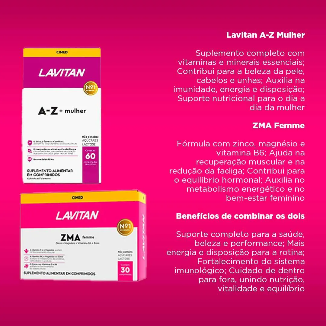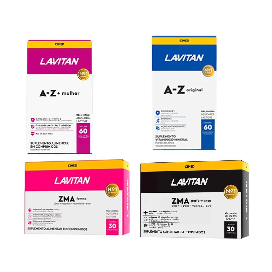 O ZMA Performance e o ZMA Femme combinam zinco, magnésio e vitamina B6, micronutrientes importantes para o metabolismo energético e o funcionamento muscular. Já os multivitamínicos Lavitan A-Z Original e Lavitan A-Z Mulher oferecem um amplo espectro de vitaminas e minerais que auxiliam na manutenção das funções corporais e complementam a alimentação.