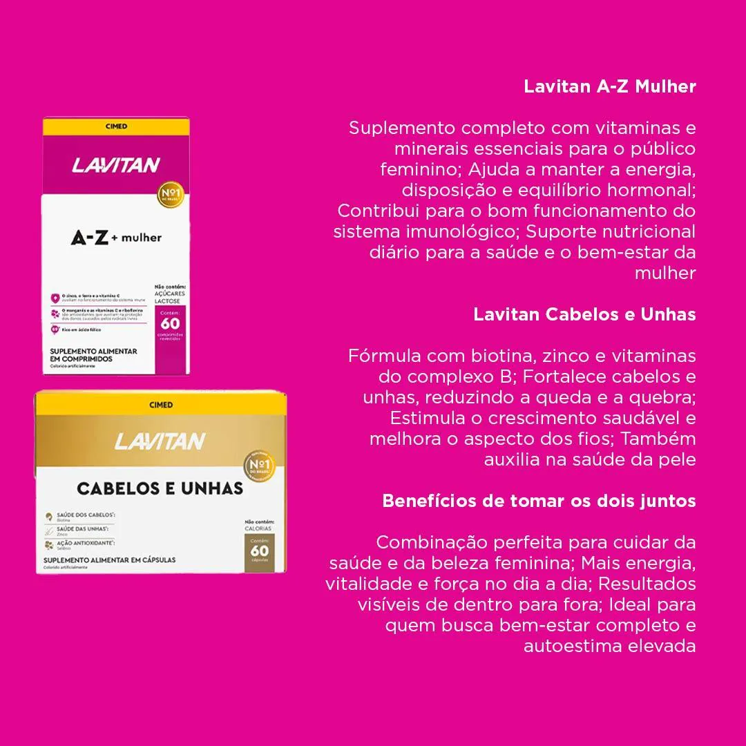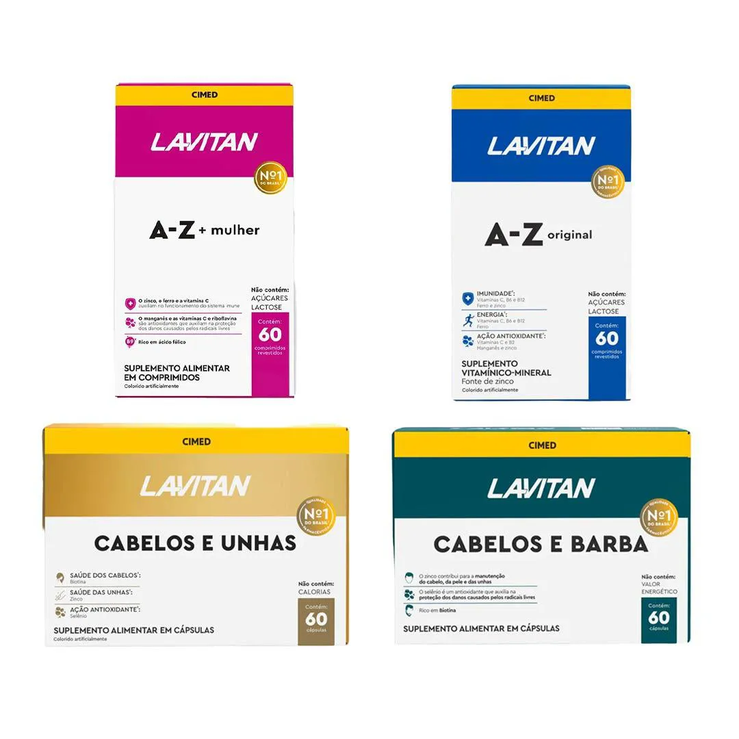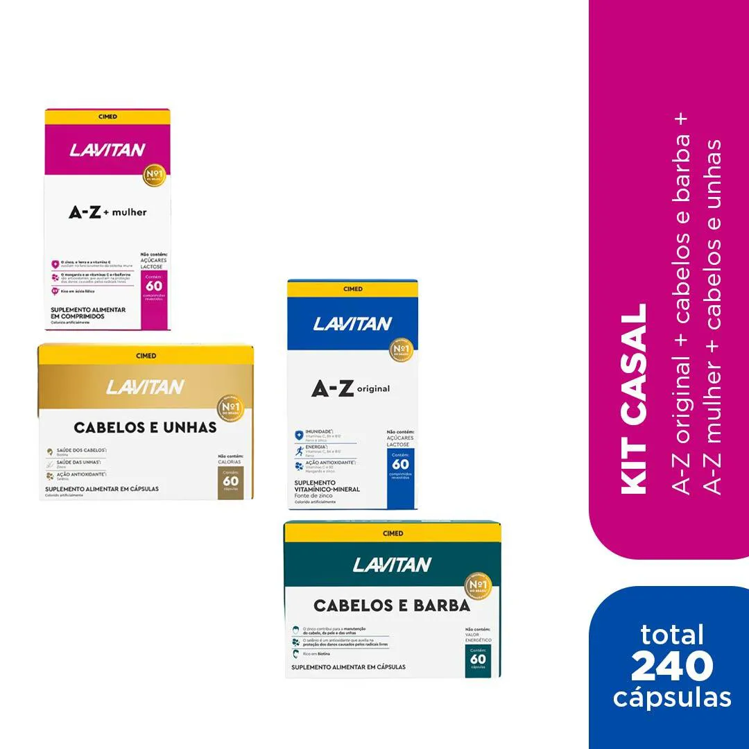 Kit Casal Lavitan A-Z & Cab Unhas e Barba - 240 Caps – Cimed O Kit Casal Lavitan A-Z & Cab Unhas e Barba - 240 Caps - Cimed foi desenvolvido para quem busca praticidade e cuidado completo na suplementação do dia a dia. Esse conjunto reúne quatro produtos da linha Lavitan, formulados para atender diferentes necessidades nutricionais de homens e mulheres. O kit é composto por Lavitan A-Z Mulher, Lavitan A-Z Original, Lavitan Cabelos e Unhas e Lavitan Cabelos e Barba, totalizando 240 cápsulas. Cada suplemento contém uma combinação equilibrada de vitaminas e minerais essenciais que participam de processos metabólicos importantes para o funcionamento do organismo. O Lavitan A-Z Original e o A-Z Mulher oferecem um mix completo de micronutrientes que auxiliam na manutenção das funções corporais e complementam a dieta diária. Já o Lavitan Cabelos e Unhas e o Lavitan Cabelos e Barba trazem nutrientes como biotina, zinco e vitaminas do complexo B, que contribuem para o suporte nutricional dos tecidos e para o equilíbrio geral. Destaques do Kit: - Kit completo com quatro suplementos Lavitan. - Fórmulas específicas para homens e mulheres. - Combinação de multivitamínicos e suplementos focados em cuidado capilar. - Total de 240 cápsulas, garantindo ótimo rendimento. - Produzido pela Cimed, marca referência em qualidade e segurança. Composição do Kit: - 1x Lavitan A-Z Mulher – 60 cápsulas - 1x Lavitan A-Z Original – 60 cápsulas - 1x Lavitan Cabelos e Unhas – 60 cápsulas - 1x Lavitan Cabelos e Barba – 60 cápsulas Modo de uso sugerido: - Consumir conforme instruções de cada embalagem ou conforme orientação de profissional de saúde. SOBRE A LOJA: Somos a rede de farmácias mais antiga de São José dos Pinhais, atuando no ramo farmacêutico desde 1990 com comprometimento à qualidade e satisfação do cliente. É um prazer compartilhar os nossos valores e as nossas conquistas com quem confia no nosso trabalho! Imagens dos Produtos são Meramente Ilustrativas. Todas as Informações Divulgadas são de Responsabilidade Exclusiva do Fabricante/fornecedor.