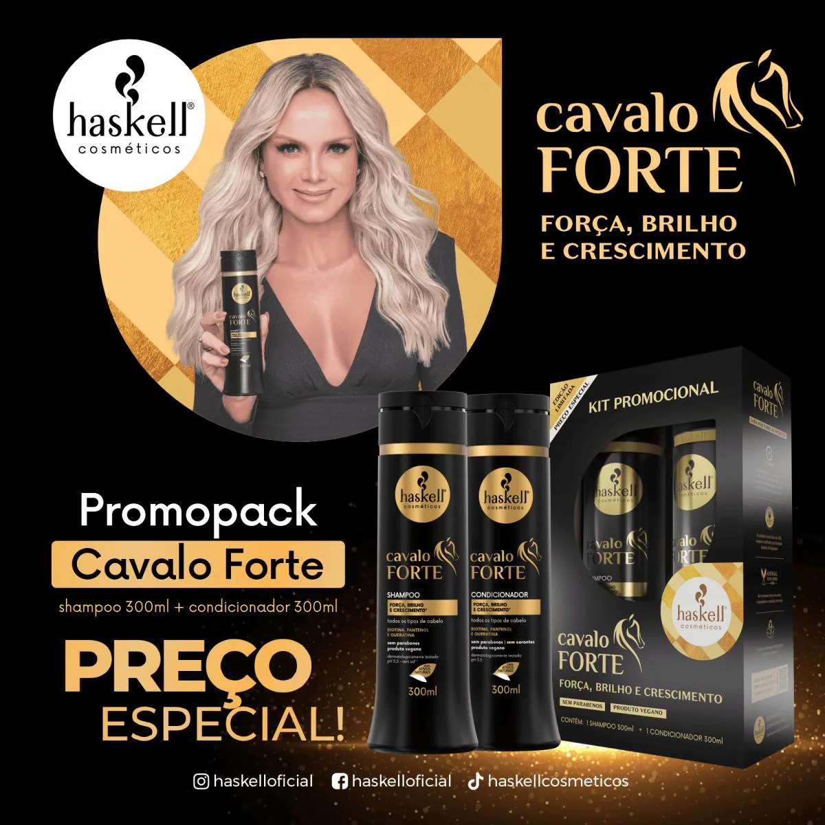 Força, brilho e crescimento para seus cabelos Aposte no poder do Kit Cavalo Forte da Haskell para cabelos mais saudáveis, resistentes e com crescimento fortalecido! Sua fórmula poderosa combina biotina, pantenol e queratina, ativos essenciais que tratam profundamente, reduzem a quebra e fortalecem desde a raiz até as pontas. ✔ Indicado para todos os tipos de cabelo