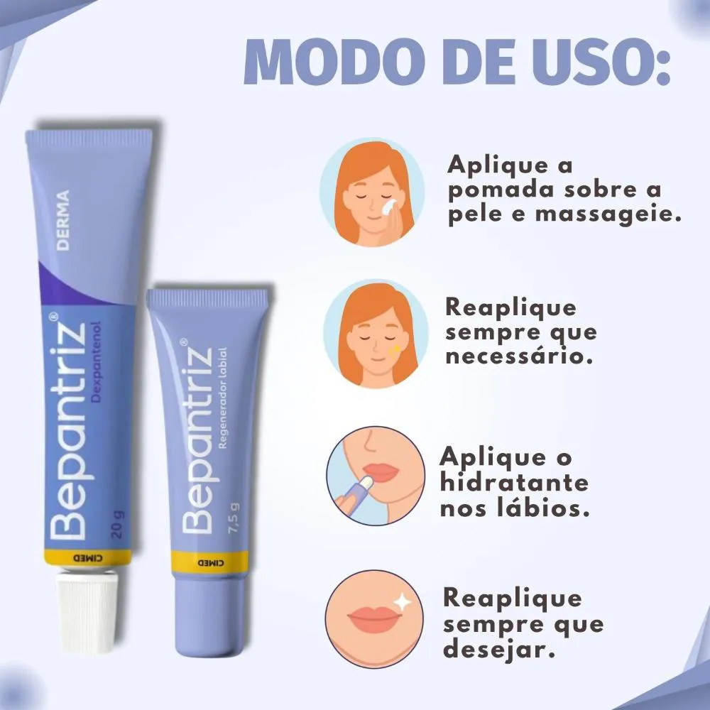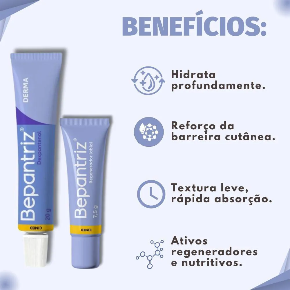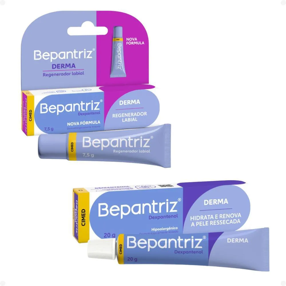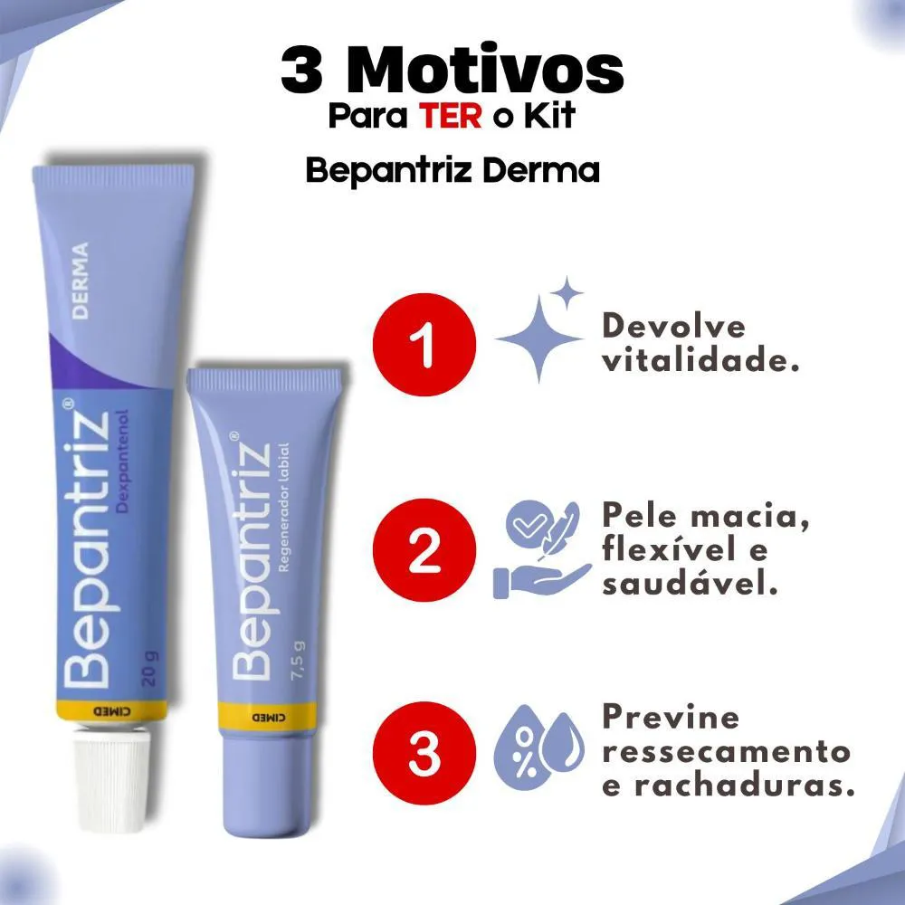 lábios. Este kit essencial, composto pela Pomada Hidrata e Renova e um Hidratante Labial, foi especialmente desenvolvido para combater o ressecamento severo, restaurar a barreira cutânea, proteger contra agressões externas e proporcionar uma duradoura sensação de conforto e bem-estar. Ideal para quem busca uma pele visivelmente saudável e lábios macios e protegidos em todas as estações do ano, o Kit Bepantriz Derma é a escolha inteligente para manter a pele ressecada profundamente hidratada, nutrida e revitalizada, devolvendo sua