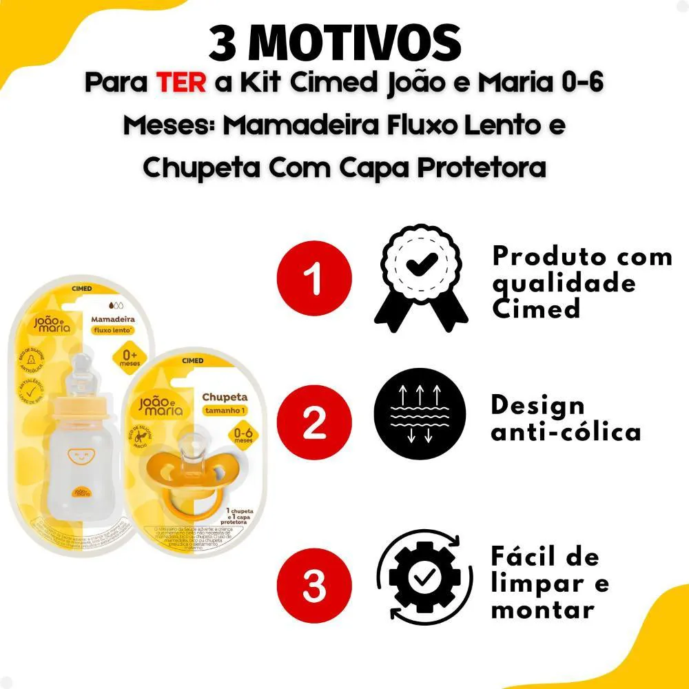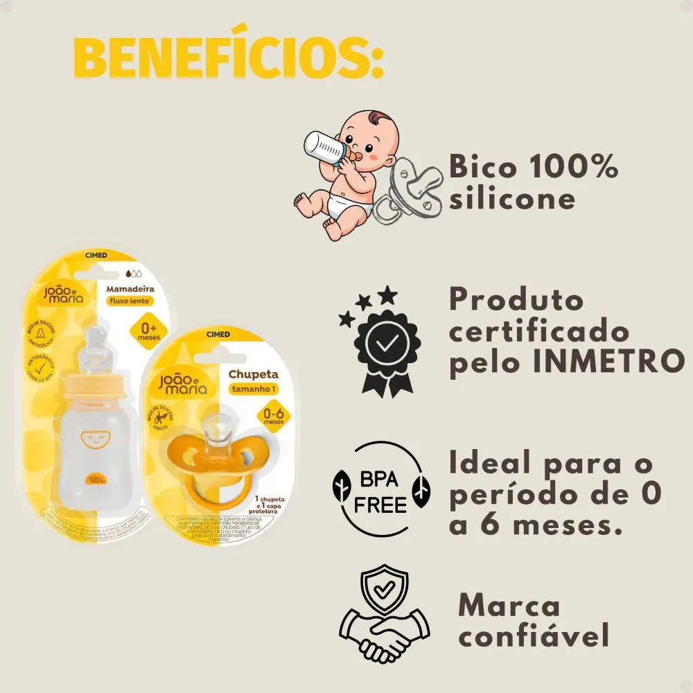 Kit Cimed João e Maria 0-6 Meses: Mamadeira Fluxo Lento 120Ml e Chupeta com Capa Protetora Tamanho 1