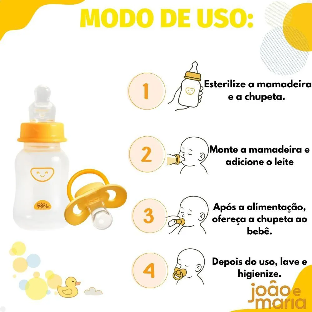 Kit Cimed João e Maria 0-6 Meses: Mamadeira Fluxo Lento 120ml e chupeta Com Capa Protetora Tamanho 1