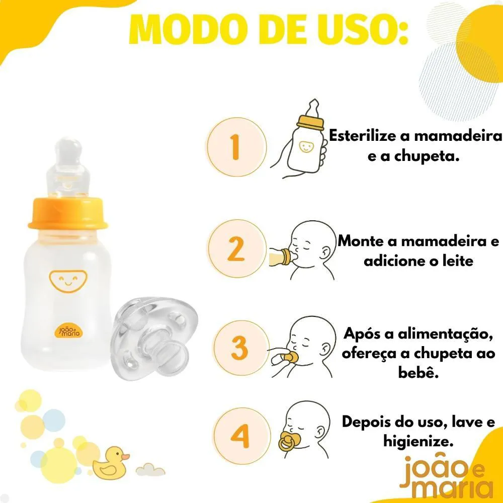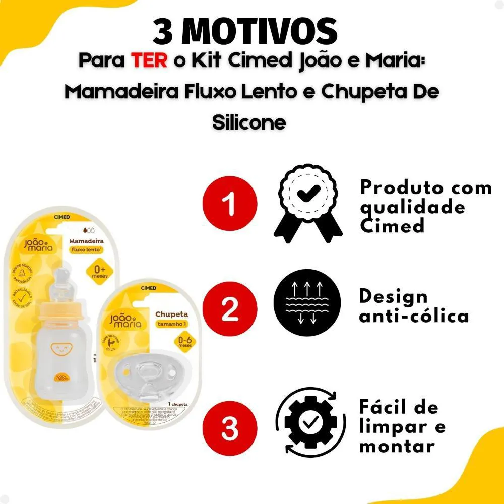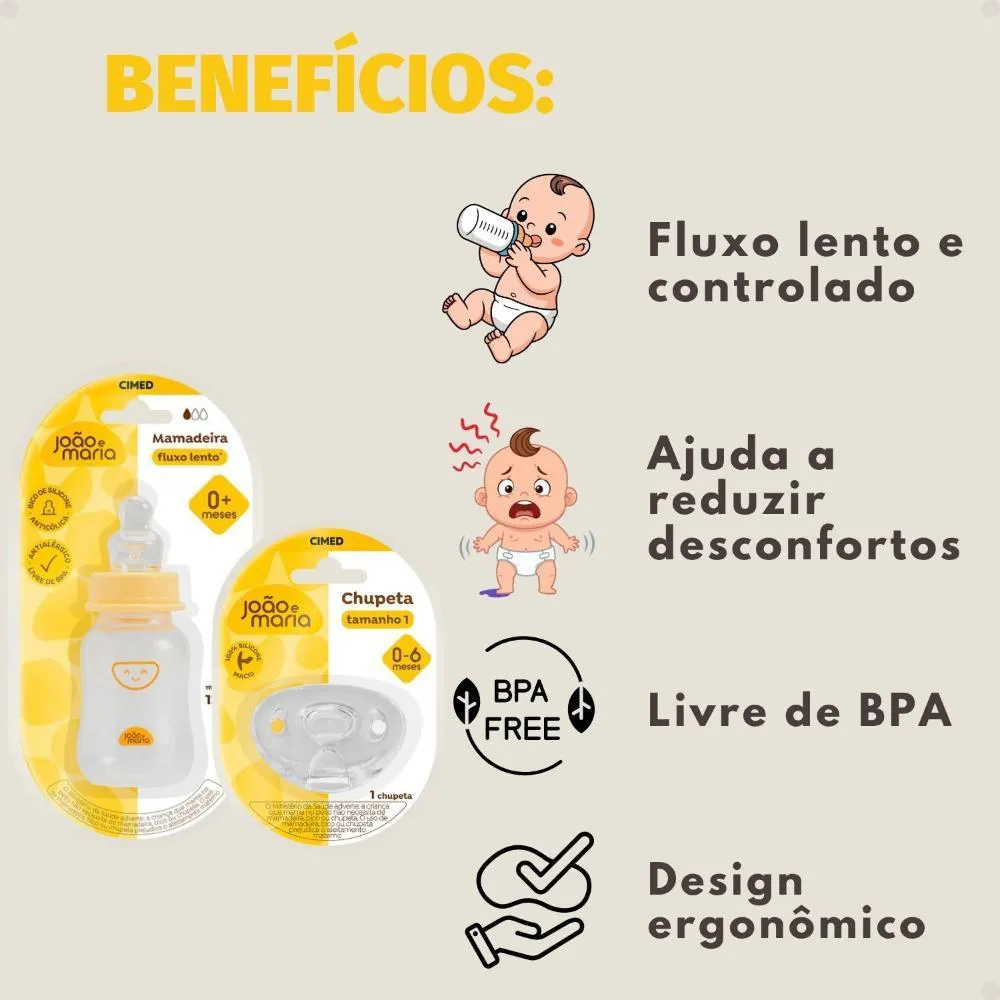 Kit Cimed João e Maria 0-6 Meses: Mamadeira Fluxo Lento 120Ml e Chupeta de Silicone Tamanho 1