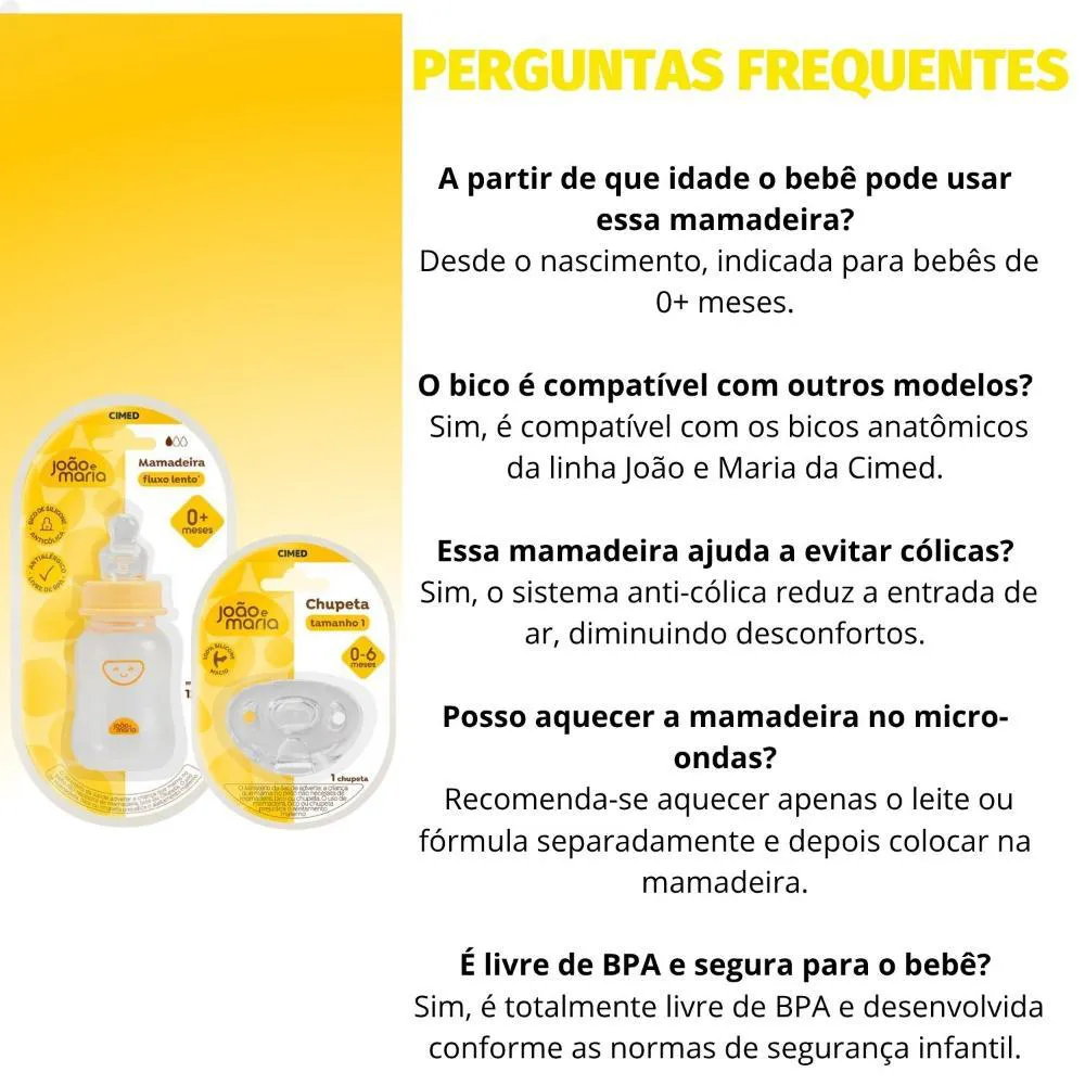 - Versatilidade para o crescimento do bebê, com compatibilidade para outros bicos João e Maria de diferentes fluxos.
