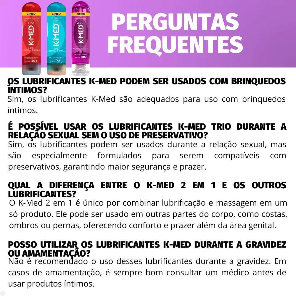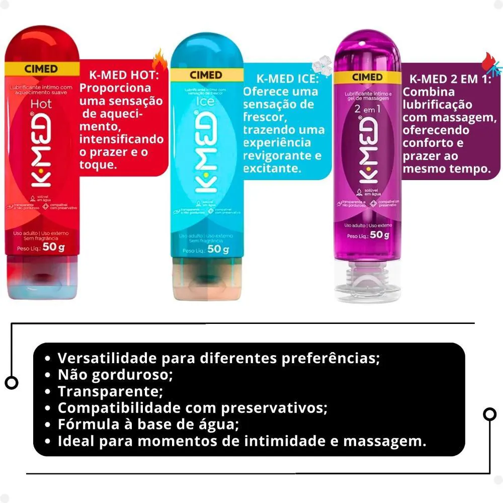 Kit Lubrificantes K-Med Trio: Hot, Ice e 2 em 1 50g Contém: - 01 K-Med 2 em 1 50g - 01 K-Med Hot 50g - 01 K-Med Ice 50g . O Kit Lubrificantes K-Med Trio: Hot, Ice e 2 em 1 50g é uma opção completa para quem busca intensificar as sensações durante momentos íntimos. Este kit inclui três tipos de lubrificantes, cada um com características e efeitos especiais: Hot: Proporciona uma sensação de aquecimento, intensificando o prazer e o toque. Ice: Oferece uma sensação de frescor, trazendo uma experiência revigorante e excitante. 2 em 1: Combina os benefícios de lubrificação com massagem, oferecendo conforto e prazer ao mesmo tempo. Com embalagens práticas de 50g, os lubrificantes são ideais para uso pessoal ou em casal, oferecendo opções variadas para atender diferentes preferências. Sua fórmula é compatível com o uso de preservativos e garante prazer e conforto durante o uso. O Kit Lubrificantes K-Med Trio é perfeito para quem deseja explorar novas sensações e tornar os momentos de intimidade ainda mais intensos e agradáveis. . Modo de usar: K-Med 2 em 1: Pode ser utilizado durante a relação sexual ou quando houver necessidade de lubrificação íntima adicional. O produto não danifica o látex podendo ser aplicado sobre o preservativo ou na região genital a ser lubrificada tanto em homens como em mulheres. Não há restrição de uso em relação à frequência e a quantidade de produto, podendo ser utilizado sempre que desejado. Como Gel de Massagem: Aplicar sobre a região a ser massageada sempre que necessário. Não há restrição de uso em relação à frequência e a quantidade do produto, podendo ser utilizado sempre que desejado. K-Med Hot: Pode ser aplicado ao redor da superfícice da vaginam diretamente no orgão genital ou no preservativo. Uso com preservativo: Colocar o preservativo e em seguida aplicar o K-Med Hot sobre o preservativo ou diretamente na área a ser lubrificada. K-Med Ice: Aplique sobre a região a ser massageada sempre que necessário. Pode ser utilizado durante a relação sexual ou quando houver necessidade de lubrificação íntima adicional. Uso com preservativo: Colocar o preservativo e em seguida, aplicar o K-Med Ice sobre o preservativo ou diretamente na área a ser lubrificada . Precauções: Não aplique sobre a pele irritada ou ferida. Em casos de irritação, suspenda o uso. Manter fora do alcance das crianças. Não utilizar durante a gravidez. Evitar contato com os olhos. Em caso de sinais de sintomar de intoxicação, suspender o uso e procurar orientação médica. Não use os produtos fora do prazo de validade. K-Med Hot e K-Med Ice são compatíveis com látex, podendo ser utilizados diretamente no preservativo. K-Med 2 em 1 não é contraceptivo e não contém nenhum espermicida. . Perguntas Frequentes O que vem no Kit Lubrificantes K-Med Trio? O kit inclui três lubrificantes de 50g cada: Hot, que proporciona sensação de aquecimento; Ice, que oferece frescor; e 2 em 1, que combina lubrificação e massagem. Posso usar os lubrificantes K-Med Trio com brinquedos íntimos? Sim, os lubrificantes K-Med Trio são adequados para uso com brinquedos íntimos, mas é importante verificar as recomendações de uso específicas para cada tipo de brinquedo. Os lubrificantes K-Med são à base de água? Sim, os lubrificantes K-Med são à base de água, o que os torna fáceis de limpar e seguros para o uso com preservativos. O Kit Lubrificantes K-Med Trio é indicado para pessoas com pele sensível? Sim, os lubrificantes são formulados para ser seguros e suaves para a pele. Porém, se você tem pele sensível ou alergias, é recomendado fazer um teste em uma pequena área da pele antes de usar. . Notificação ANVISA K-Med 2 em 1: 1.04381.00005 K-Med Hot: 1.04381.00003 K-Med Ice: 8.13136.39001
