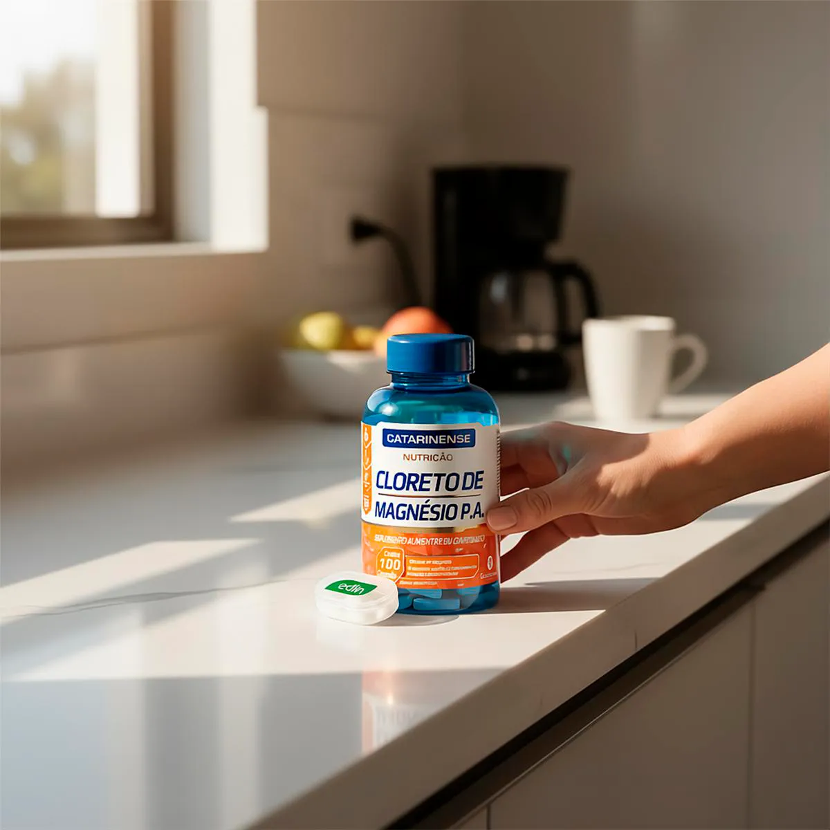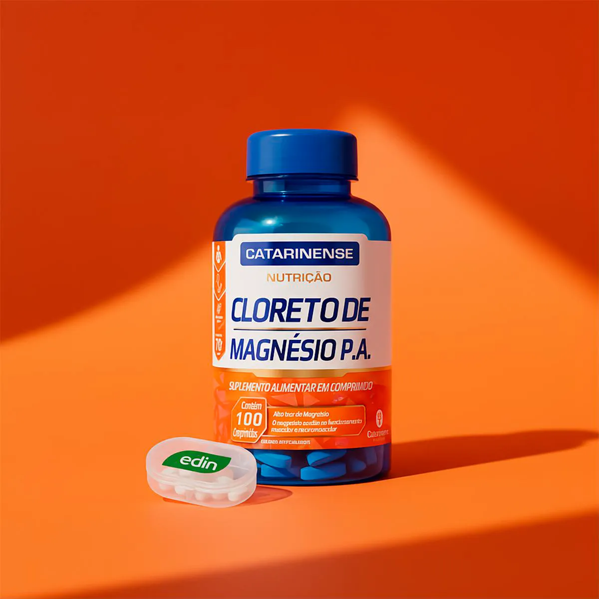 Cloreto de Magnésio Catarinense 100 Comprimidos + Porta Cápsulas Modo de consumo: Ingerir de 1 a 3 comprimidos ao dia, ou conforme orientação de profissional de saúde. Produto indicado para adultos a partir de 19 anos. Ingredientes: Cloreto de magnésio, água purificada, amido de milho, carbonato de cálcio, dióxido de silício, estearato de magnésio, hidroxipropilmetilcelulose, polivinilpirrolidona, polietileno glicol, dióxido de titânio. Não contém glúten. Zero açúcares. Zero lactose. Informações técnicas: Acompanha porta cápsulas. Este produto não é um medicamento. Não exceder a recomendação diária de consumo indicada na embalagem. Não deve ser consumido por gestantes, lactantes e crianças. Conservar na embalagem original, em local seco, fresco, ao abrigo da luz e umidade. Suplemento alimentar dispensado de registro conforme RDC nº 240/2018.