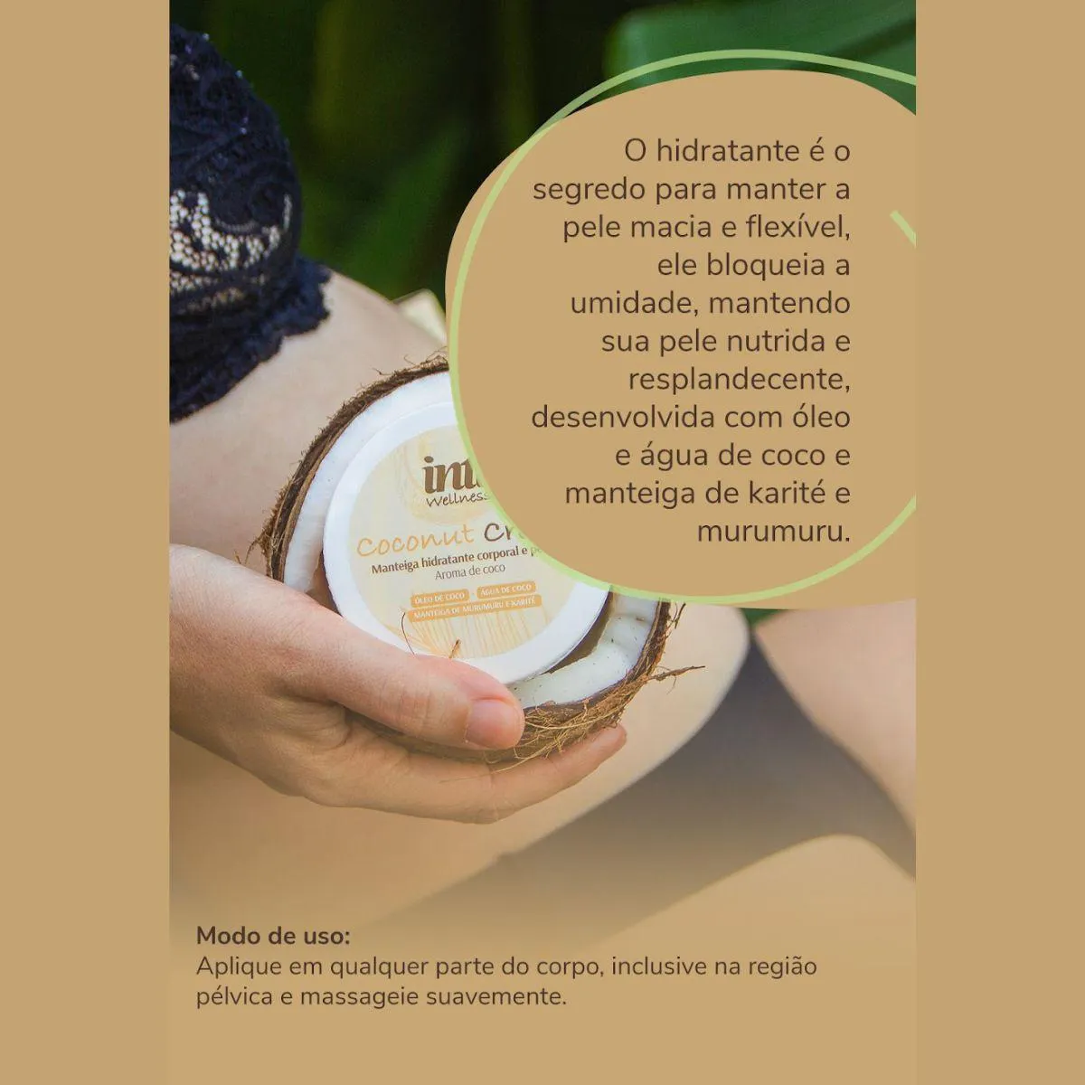 - Manteiga Hidratante Coconut Cream (90g): Hidrata profundamente com óleo de coco, murumuru e karité. Deixa a pele macia, elástica e perfumada com aroma de coco.