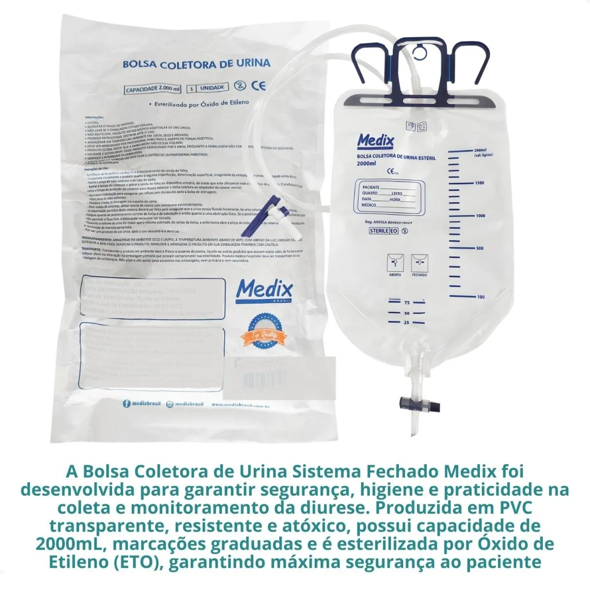 A Bolsa Coletora de Urina Sistema Fechado Medix foi desenvolvida para garantir segurança, higiene e praticidade na coleta e monitoramento da diurese. Produzida em PVC transparente, resistente e atóxico, possui capacidade de 2000mL, marcações graduadas e é esterilizada por Óxido de Etileno (ETO), garantindo máxima segurança ao paciente. Indicada para uso hospitalar, ambulatorial e home care, permitindo visualização clara do volume coletado e reduzindo riscos de contaminação.