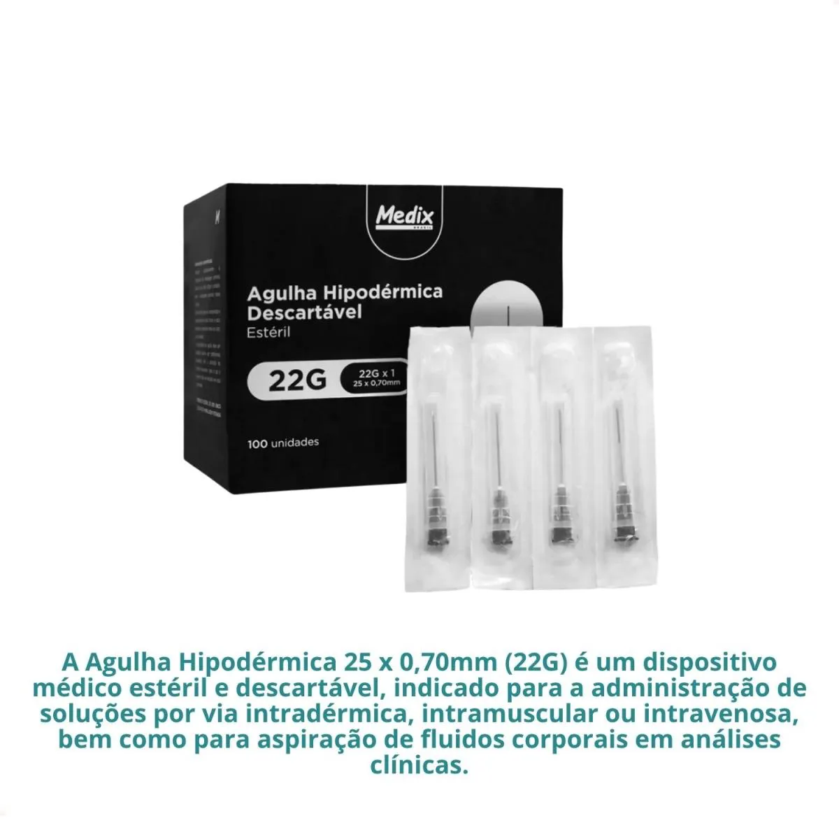 A Agulha Hipodérmica 25 x 0,70mm (22G) é um dispositivo médico estéril e descartável, indicado para a administração de soluções por via intradérmica, intramuscular ou intravenosa, bem como para aspiração de fluidos corporais em análises clínicas.