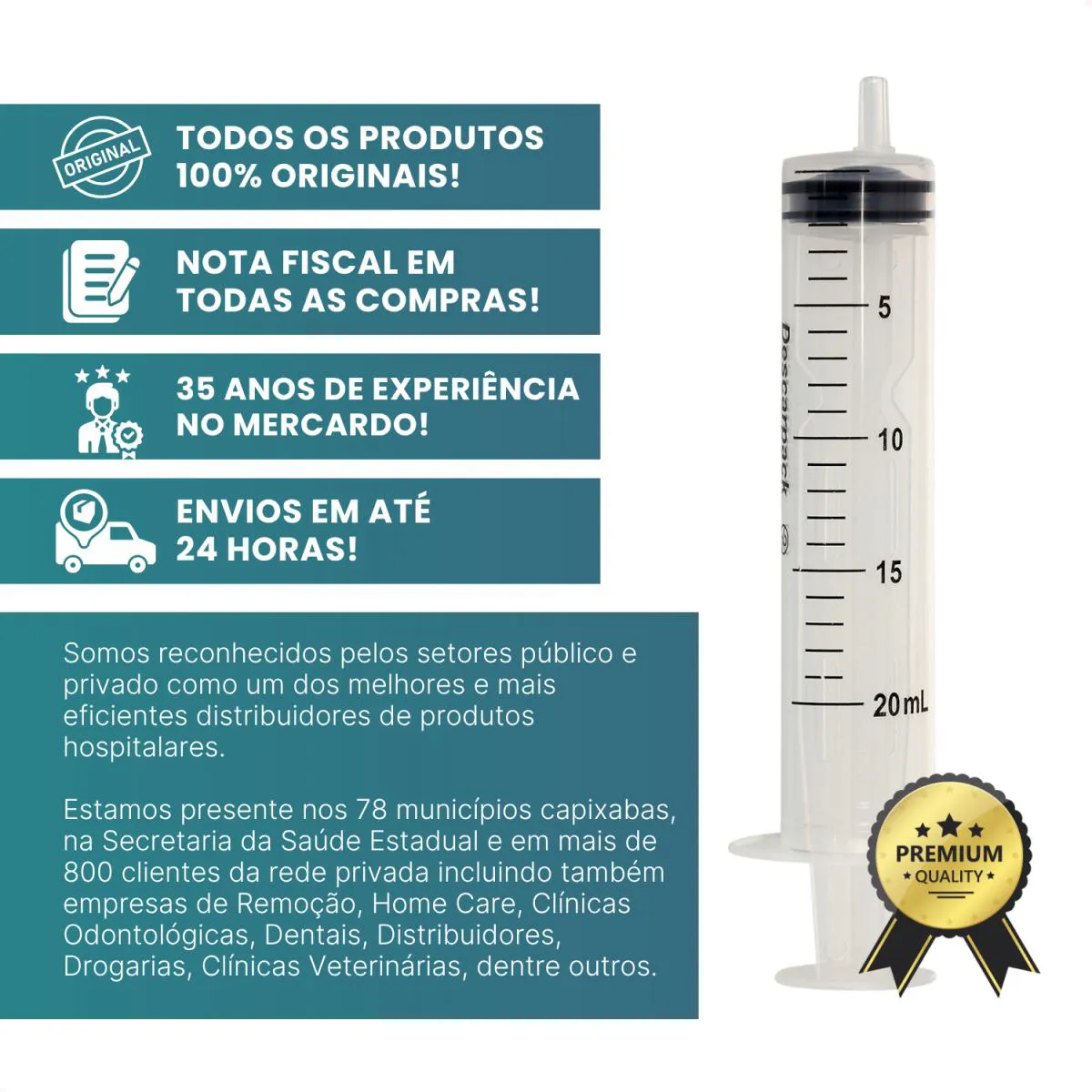 Desde 1990 atuamos com foco em licitações públicas para atendimento a hospitais e clínicas médicas do ES. Somos reconhecidos pelos setores público e privado como um dos melhores e mais eficientes distribuidores de produtos hospitalares, afinal, estamos presente nos 78 municípios capixabas, na Secretaria da Saúde Estadual e em mais de 800 clientes da rede privada incluindo também empresas de Remoção, Home Care, Clínicas Odontológicas, Dentais, Distribuidores, Drogarias, Clínicas Veterinárias, dentre outros.
