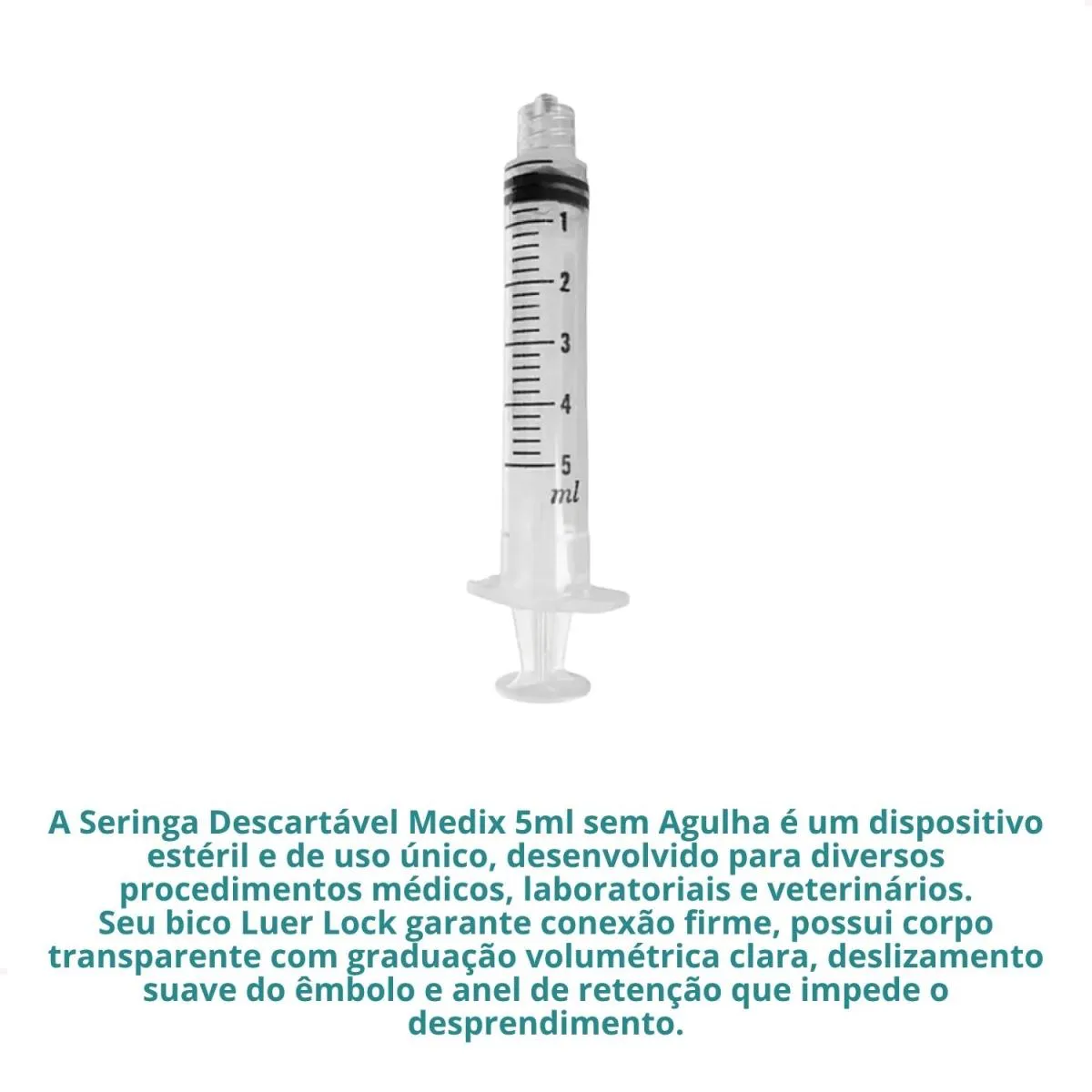 A Seringa Descartável Medix 5ml sem Agulha é um dispositivo estéril e de uso único, desenvolvido para administração precisa de medicamentos e soluções em diversos procedimentos médicos, laboratoriais e veterinários.