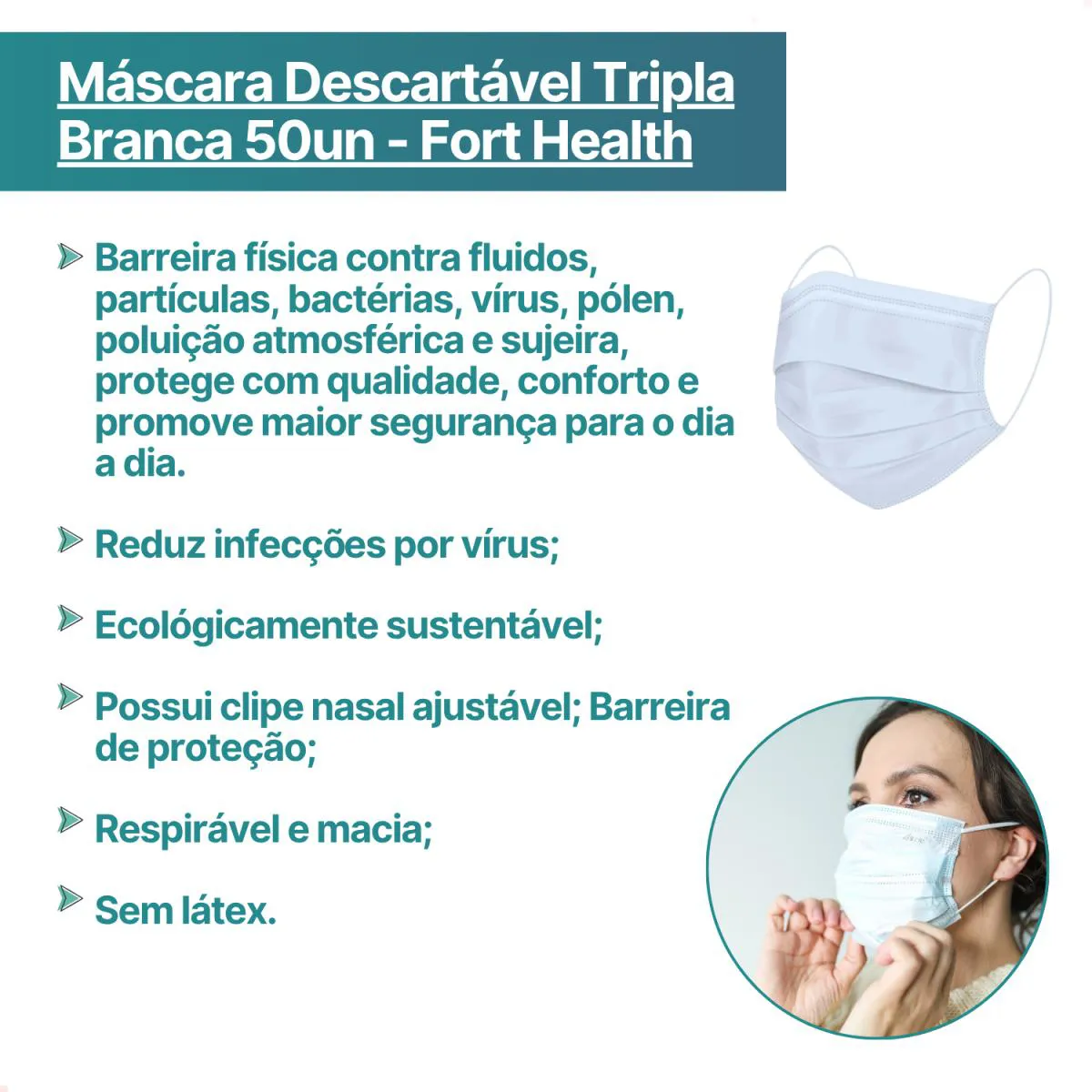 Confeccionada em não tecido, possui tres camadas sobrepostas e soldadas eletronicamente por ultrassom, sendo a camada interna e externa constituídas de não tecido spunbond, que é macio e resistente, e a camada intermediária composta de não tecido meltblown, que é o elemento filtrante, garantindo a proteção bacteriana e evitando o contato com fluídos corporais.Proteção da boca e vias nasais, minimizando a contaminação do ambiente com secreções respiratórias geradas pelo usuário do produto.