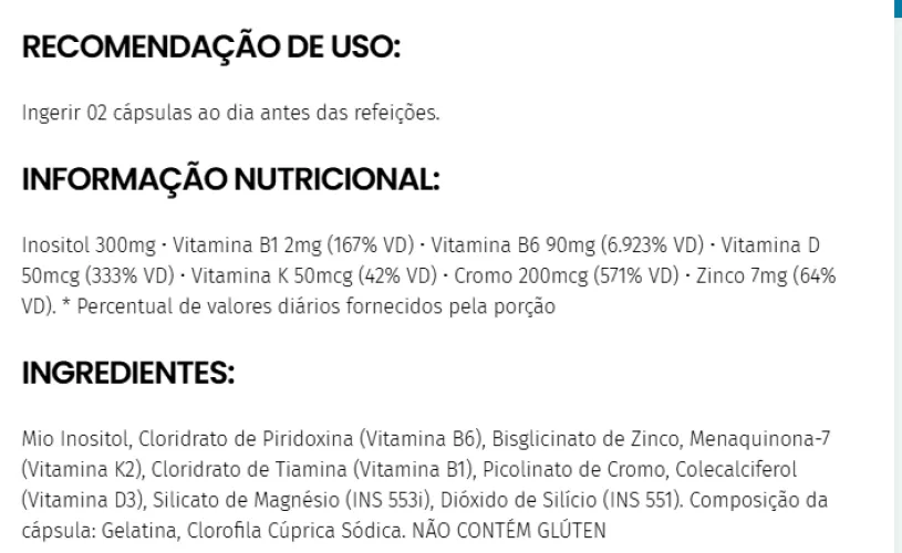 Mio-Inositol, Cloridrato de Piridoxina (vitamina B6) Bisglicinato de Zinco, Menaquinona-7 (Vitamina K2), Cloridrato de Tiamina (Vitamina B1), Picolinato de Cromo, Colecalciferol (Vitamina D3) Silicato de magnésio (INS 553i), Dióxido de silício (551).