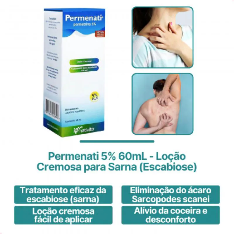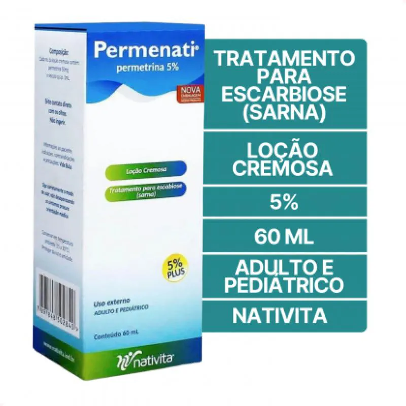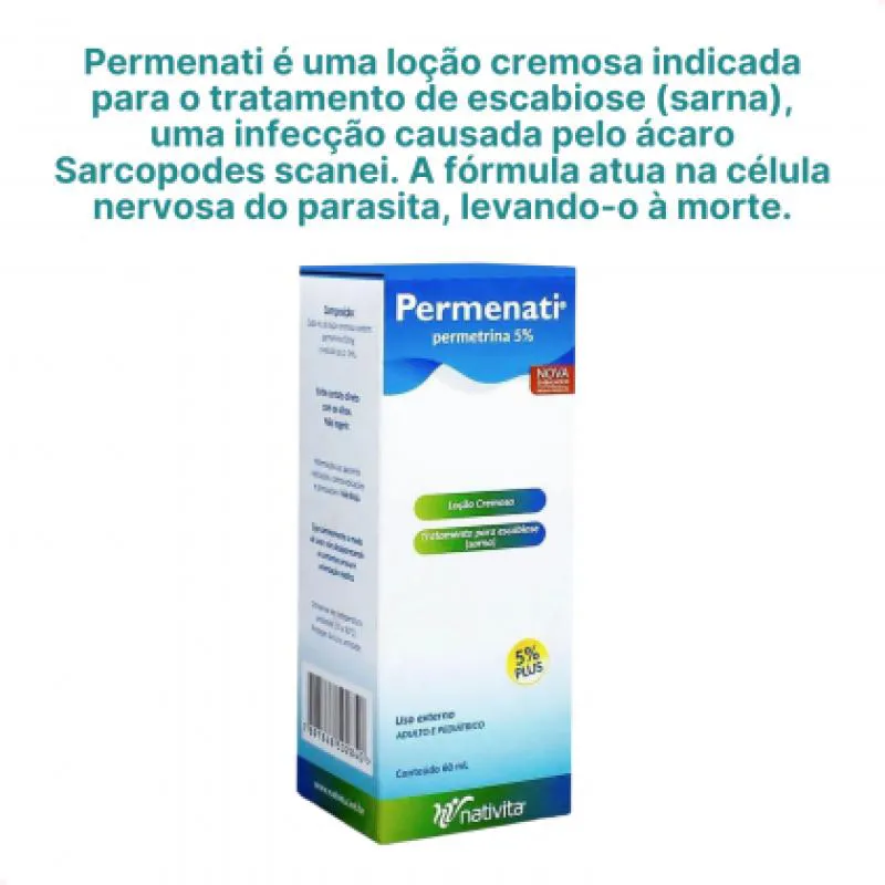 Permenati é uma loção cremosa indicada para o tratamento de escabiose (sarna), uma infecção causada pelo ácaro Sarcopodes scanei. A fórmula atua na célula nervosa do parasita, levando-o à morte.