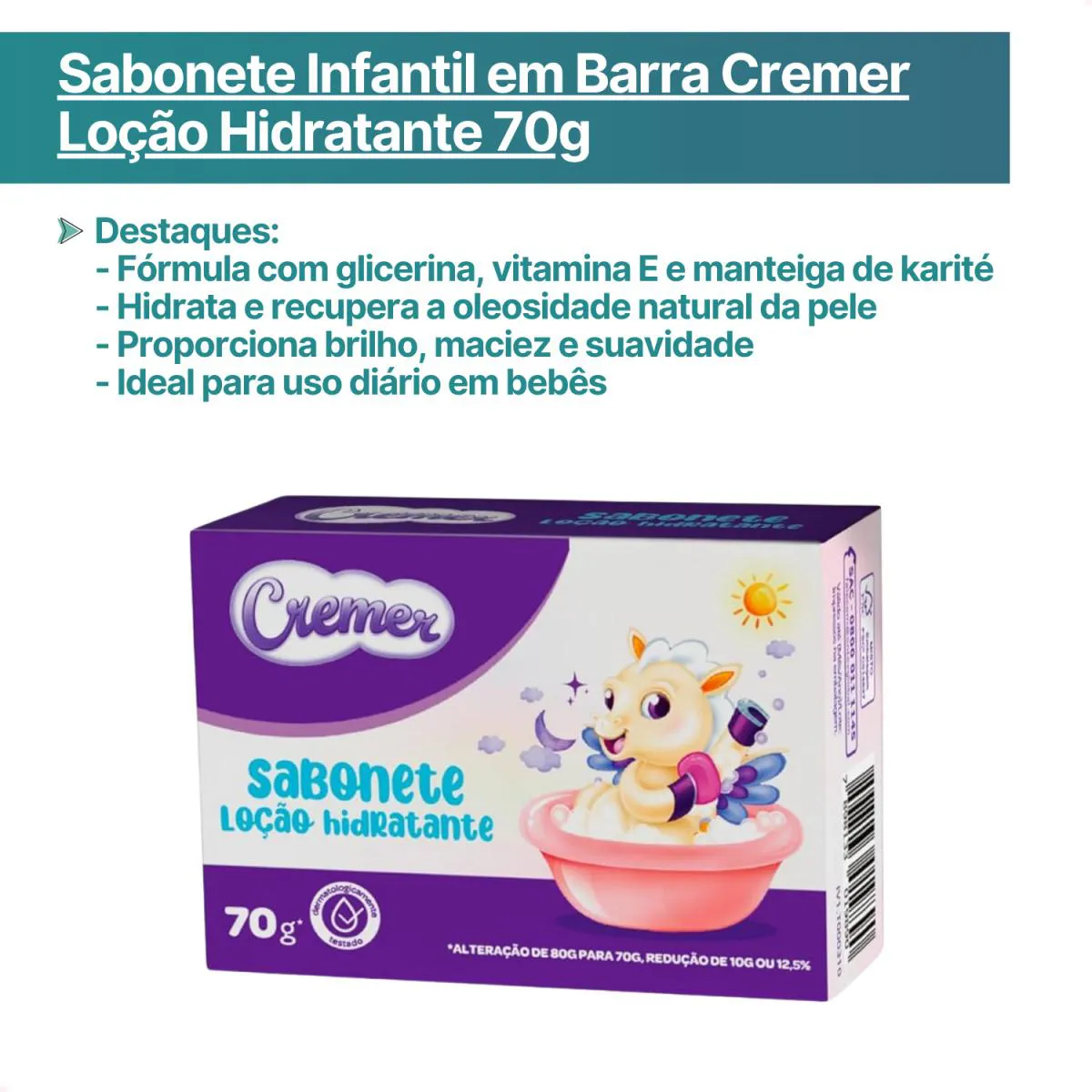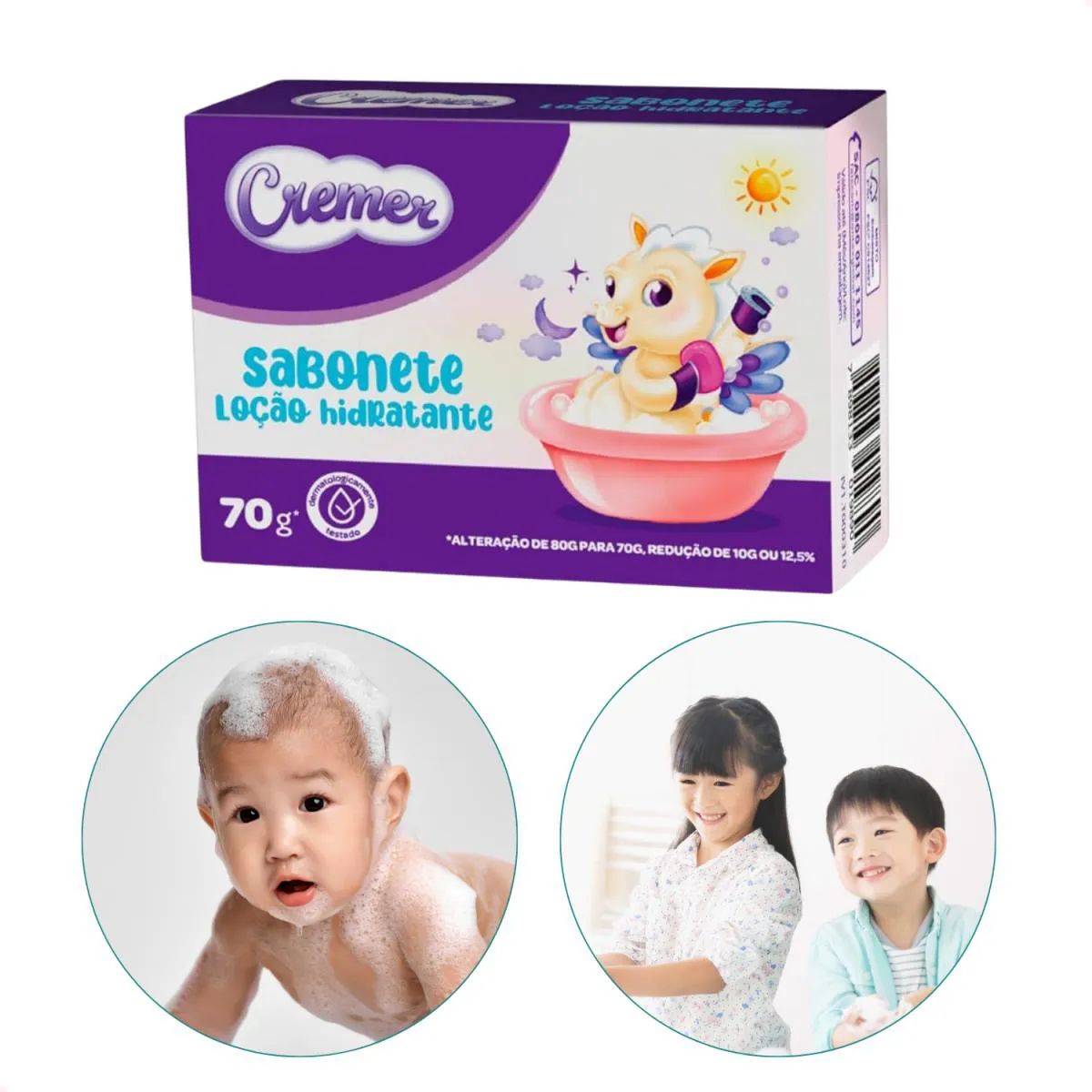 Sabonete da Cremer infantil Loção Hidratante foi desenvolvido especialmente para a pele delicada do bebê, deixando-o limpinho, protegido e com um cheirinho encantador - Sua fórmula com manteiga de karité auxilia na recuperação da oleosidade natural da pele, proporcionando brilho e maciez. Modo de usoAplique na pele utilizando as mãos, espalhando pelo corpo. Enxágue em seguida.