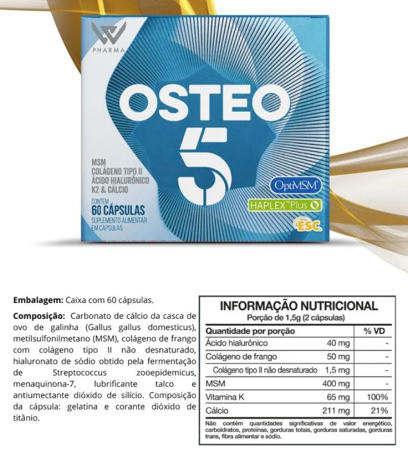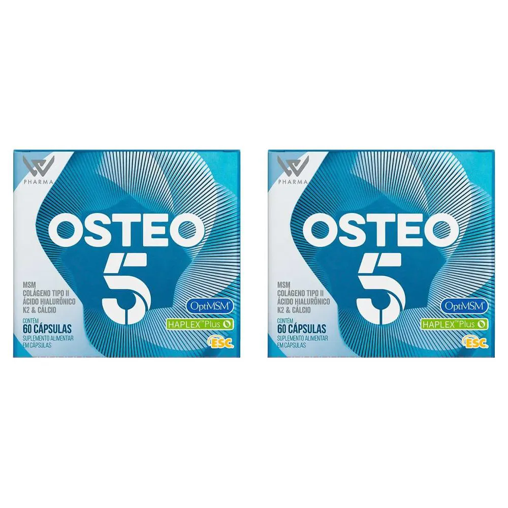 Kit Com 2 Suplementos Alimentar Osteo 5 Com 60 Cápsulas - Prowin     O Osteo 5 possui as melhores moléculas com selos de importantes laboratórios, para manutenção e formação dos ossos.     Imagens Meramente Ilustrativas. Todas as Informações Divulgadas são de Responsabilidade Exclusiva do Fabricante/fornecedor.
