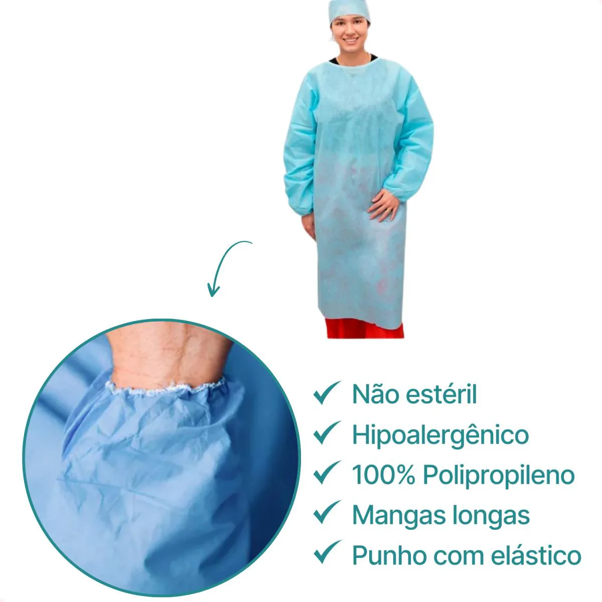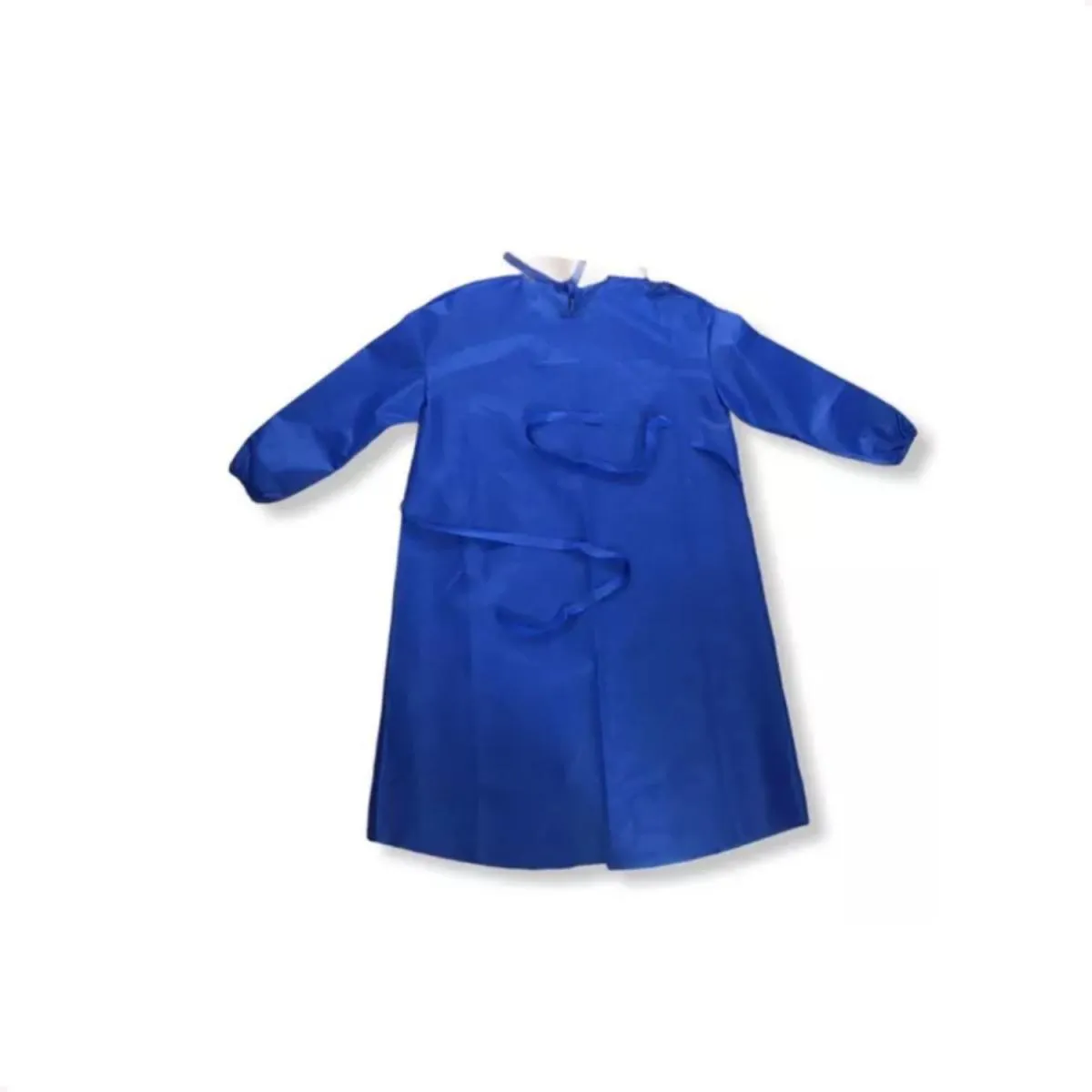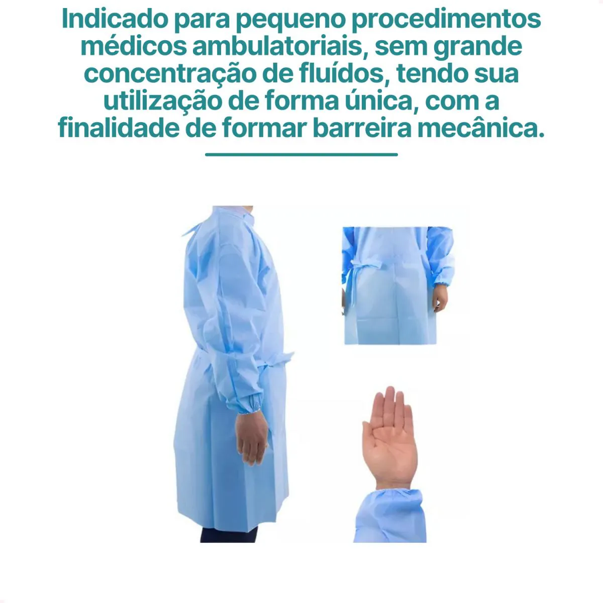 Os aventais são equipamentos de proteção individual descartáveis, confeccionados em material SMS (Spunbond, Meltblown, Spunbond) na cor azul, com mangas longas, elástico e tiras na cintura. São projetados para uso em ambiente hospitalar e cirúrgico, embalados individualmente em envelope de papel grau-cirúrgico.