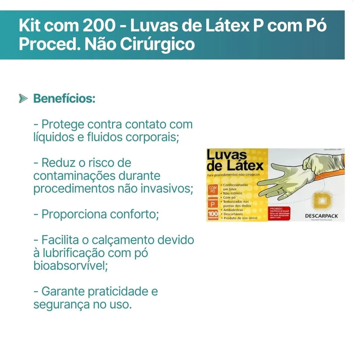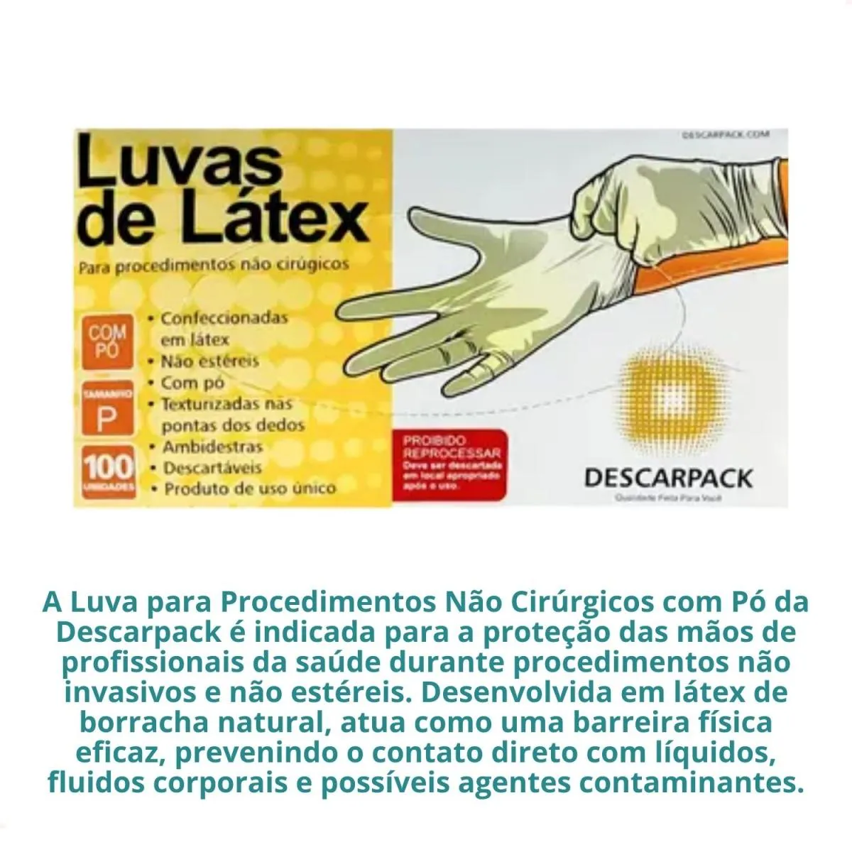 A Luva para Procedimentos Não Cirúrgicos com Pó da Descarpack é indicada para a proteção das mãos de profissionais da saúde durante procedimentos não invasivos e não estéreis. Desenvolvida em látex de borracha natural, atua como uma barreira física eficaz, prevenindo o contato direto com líquidos, fluidos corporais e possíveis agentes contaminantes.