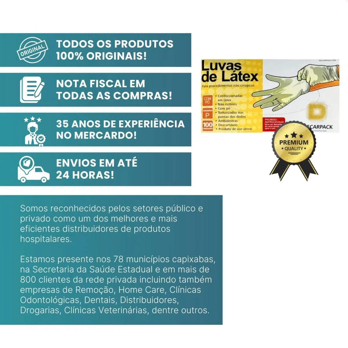 Desde 1990 atuamos com foco em licitações públicas para atendimento a hospitais e clínicas médicas do ES. Somos reconhecidos pelos setores público e privado como um dos melhores e mais eficientes distribuidores de produtos hospitalares, afinal, estamos presentes nos 78 municípios capixabas, na Secretaria da Saúde Estadual e em mais de 800 clientes da rede privada, incluindo também empresas de Remoção, Home Care, Clínicas Odontológicas, Dentais, Distribuidores, Drogarias, Clínicas Veterinárias, dentre outros.