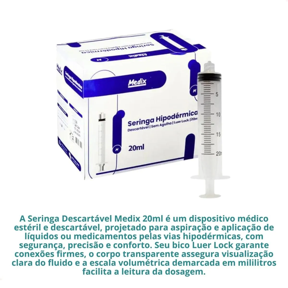 A Seringa Descartável Medix 20ml sem Agulha é um dispositivo médico estéril e descartável, projetado para aspiração e aplicação de líquidos ou medicamentos pelas vias hipodérmicas, com segurança, precisão e conforto.