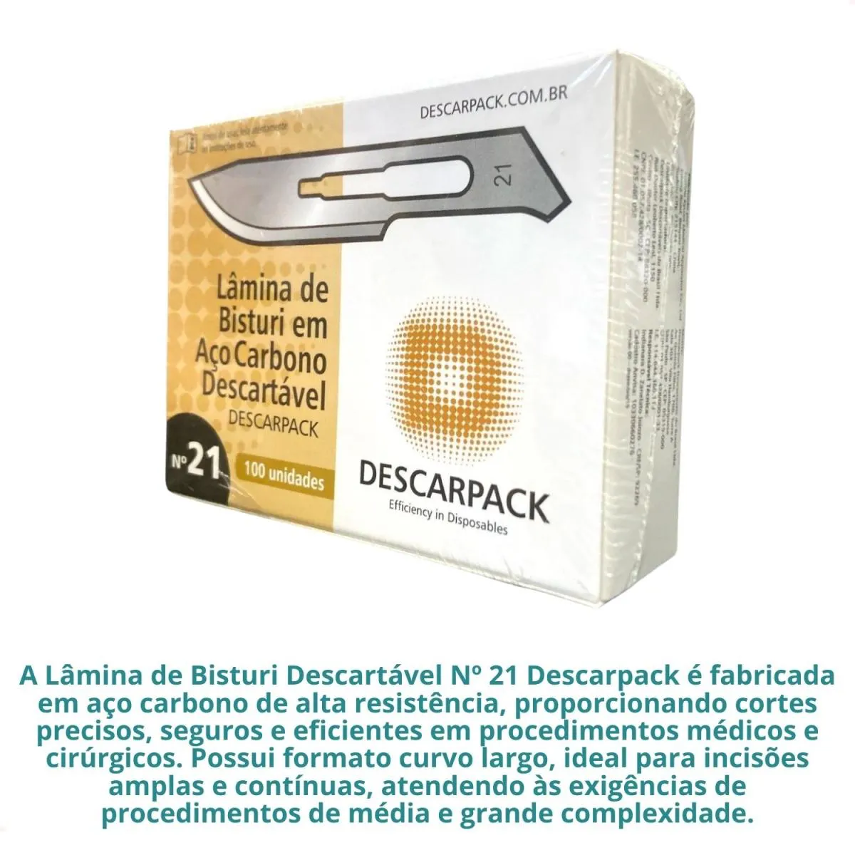 A Lâmina de Bisturi Descartável Nº 21 Descarpack é fabricada em aço carbono de alta resistência, proporcionando cortes precisos, seguros e eficientes em procedimentos médicos e cirúrgicos. Possui formato curvo largo, ideal para incisões amplas e contínuas, atendendo às exigências de procedimentos de média e grande complexidade.