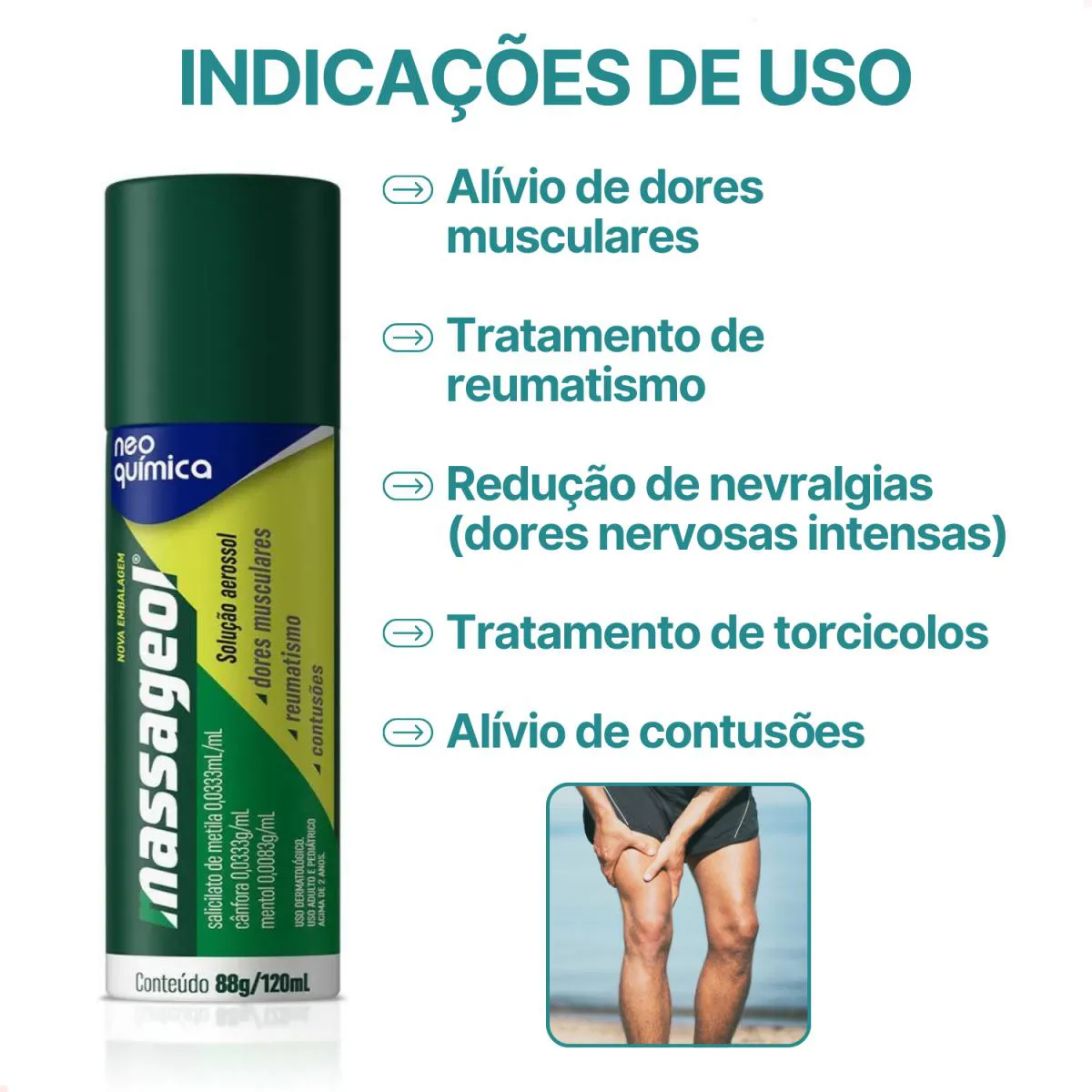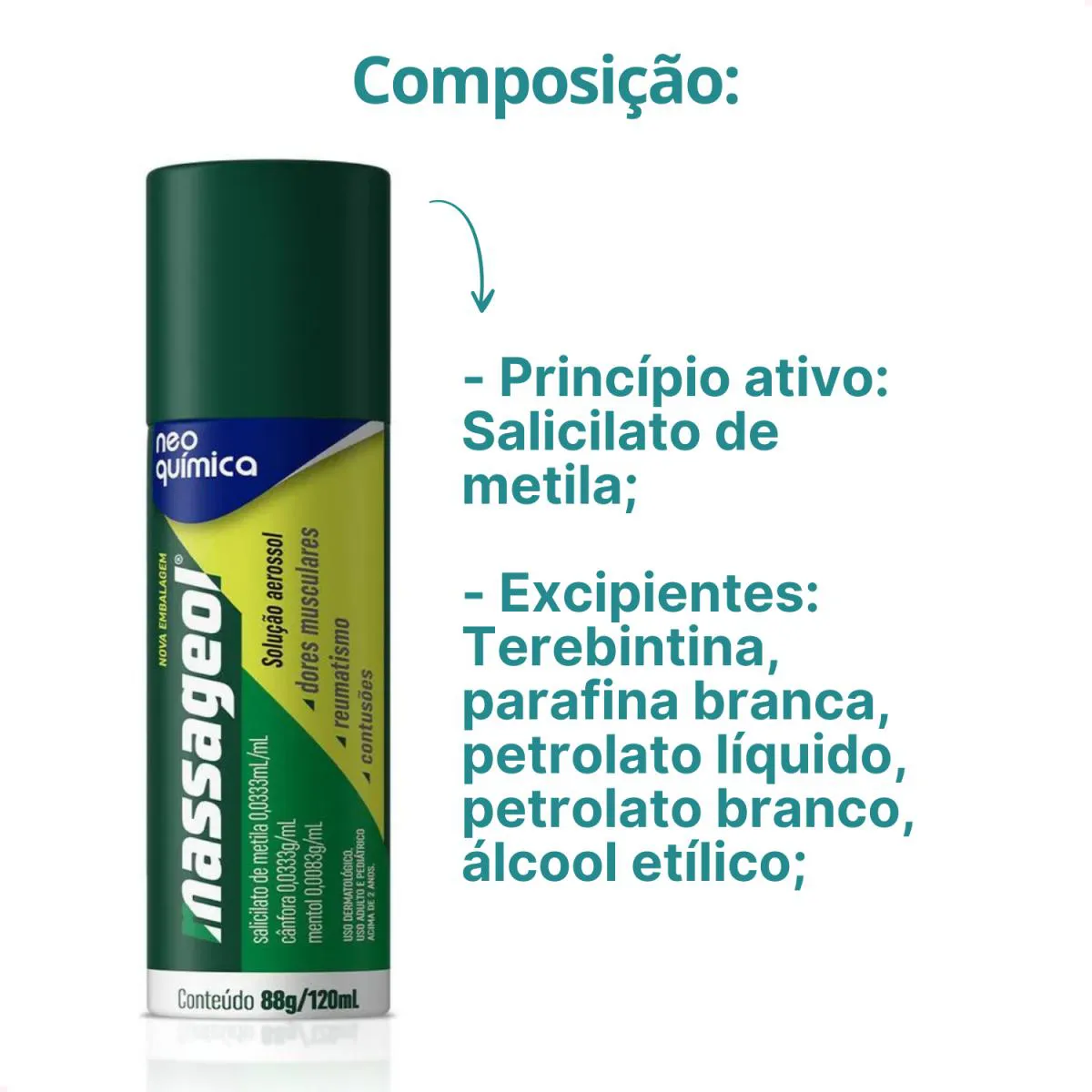 O Massageol Aerosol 120ml é um medicamento de uso exclusivamente dermatológico, indicado para aliviar sintomas como dores musculares, reumatismo, nevralgias e torcicolos.