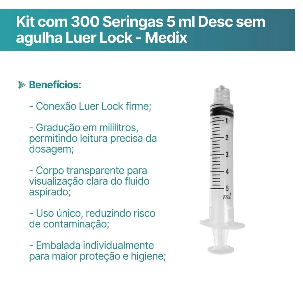 Kit com 300 Seringas 5 Ml Desc sem Agulha Luer Lock - Medix