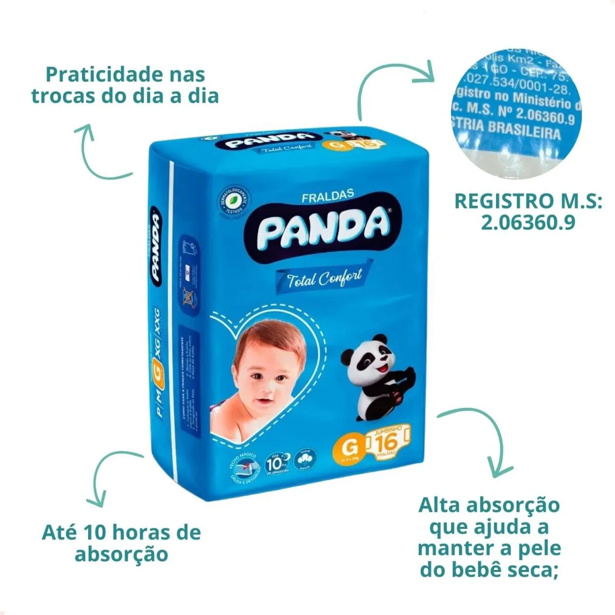 A Fralda Descartável Panda Jumbo G foi desenvolvida para oferecer conforto, absorção e praticidade no cuidado diário do bebê. Com design anatômico e materiais suaves, proporciona maior liberdade de movimento e adaptação ao corpo da criança. Sua estrutura ajuda na retenção de líquidos, contribuindo para manter a pele do bebê seca por mais tempo e garantindo proteção e tranquilidade no dia a dia.