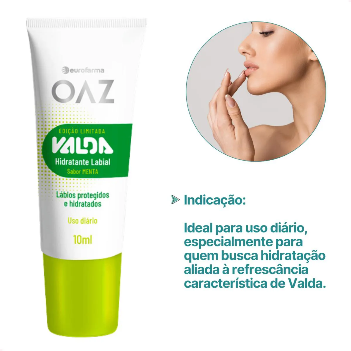 O Hidratante Labial OAZ Valda Menta combina hidratação profunda com uma sensação única de refrescância. Enriquecido com Manteiga de Karité e vitamina e, oferece nutrição intensa e ação antioxidante. Conta ainda com o exclusivo SymRepair® 100, que ajuda a restaurar e proteger os lábios contra o ressecamento diário.