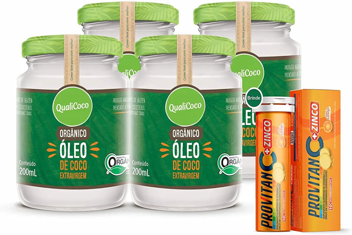 Kit Com 4 Óleos de Coco Extravirgem Orgânico 200ml Qualicoco + 1 ProvitaC 10 Comprimidos.