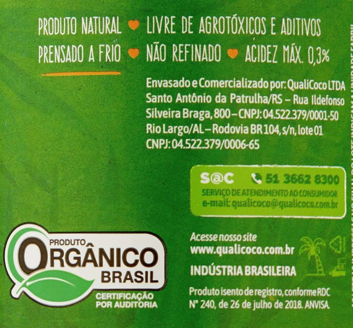 Produto obtido por meio de prensagem mecânica a frio, a partir da amêndoa do coco (Cocos nucifera L.), conhecido popularmente como coco-da-bahia, 100% natural, mantendo as propriedades benéficas do coco. Por ser produto orgânico não é permitido o uso de aditivos, conservantes, fertilizantes e agrotóxicos, preservando o meio ambiente e à saúde.