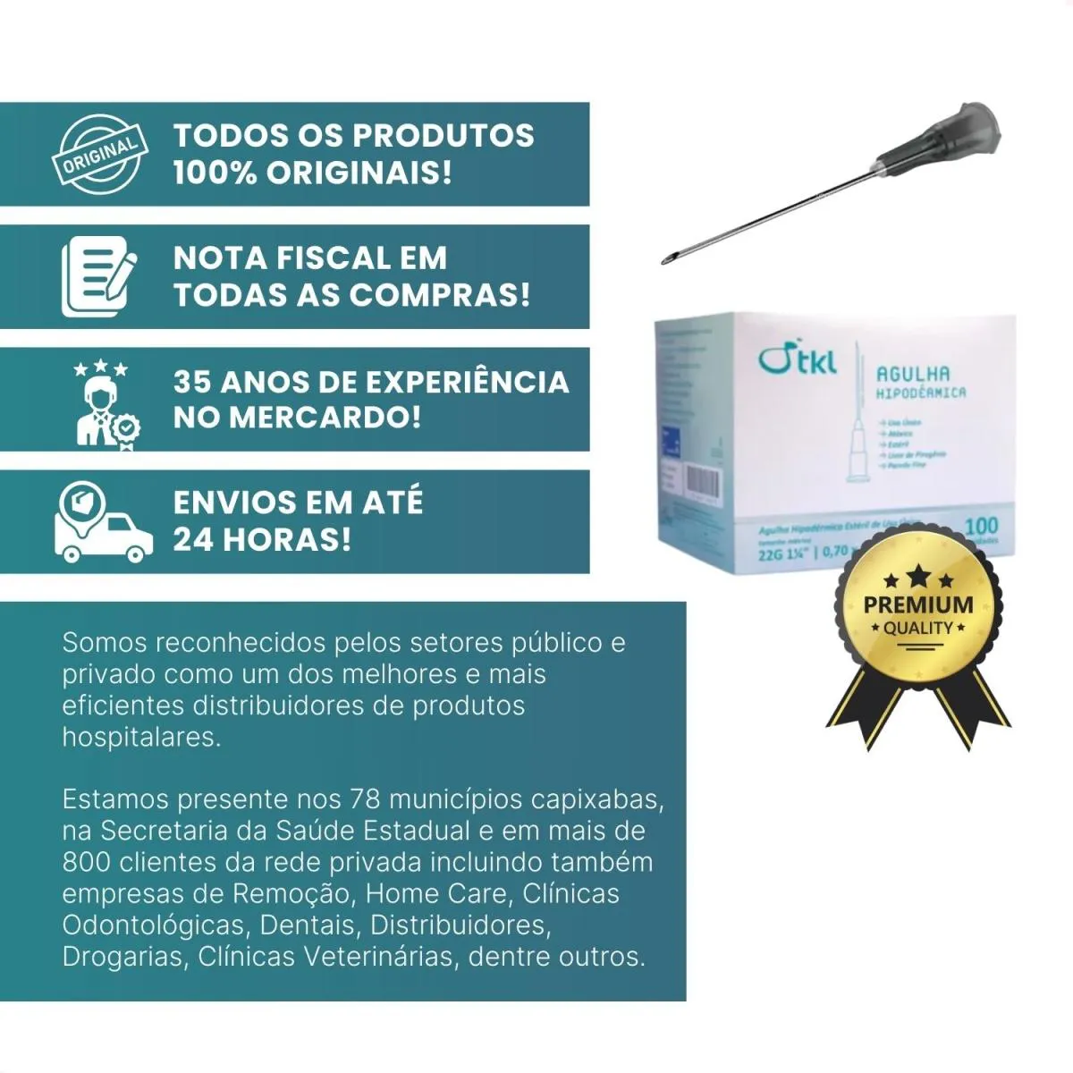 Desde 1990 atuamos com foco em licitações públicas para atendimento a hospitais e clínicas médicas do ES. Somos reconhecidos pelos setores público e privado como um dos melhores e mais eficientes distribuidores de produtos hospitalares, afinal, estamos presentes nos 78 municípios capixabas, na Secretaria da Saúde Estadual e em mais de 800 clientes da rede privada, incluindo também empresas de Remoção, Home Care, Clínicas Odontológicas, Dentais, Distribuidores, Drogarias, Clínicas Veterinárias, dentre outros.
