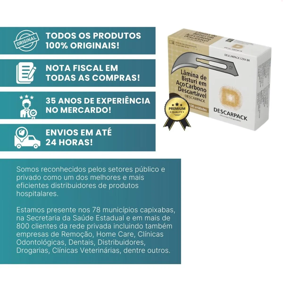 Desde 1990 atuamos com foco em licitações públicas para atendimento a hospitais e clínicas médicas do Espírito Santo. Somos reconhecidos pelos setores público e privado como um dos mais eficientes distribuidores de produtos hospitalares, estando presentes nos 78 municípios capixabas, na Secretaria da Saúde Estadual e em mais de 800 clientes da rede privada, incluindo empresas de Remoção, Home Care, Clínicas Odontológicas, Dentais, Distribuidores, Drogarias e Clínicas Veterinárias.