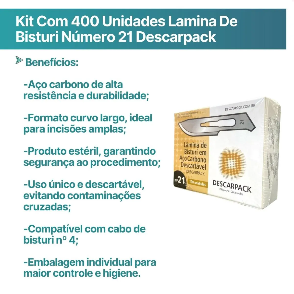 Kit com 400 Unidades Lamina de Bisturi Número 21 Descarpack