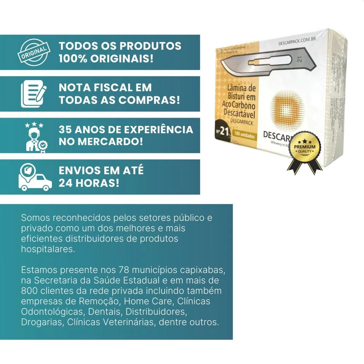 Desde 1990 atuamos com foco em licitações públicas para atendimento a hospitais e clínicas médicas do Espírito Santo. Somos reconhecidos pelos setores público e privado como um dos mais eficientes distribuidores de produtos hospitalares, estando presentes nos 78 municípios capixabas, na Secretaria da Saúde Estadual e em mais de 800 clientes da rede privada, incluindo empresas de Remoção, Home Care, Clínicas Odontológicas, Dentais, Distribuidores, Drogarias e Clínicas Veterinárias.