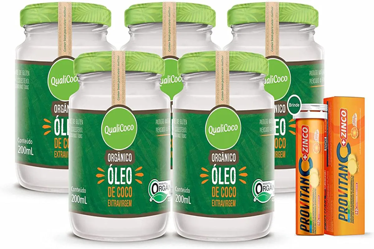 Kit Com 5 Óleos de Coco Extravirgem Orgânico 200ml Qualicoco + 1 ProvitaC 10 Comprimidos.