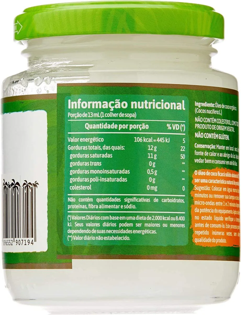 Óleo de coco orgânico (Cocos nucifera L.). Não Contém Glúten.