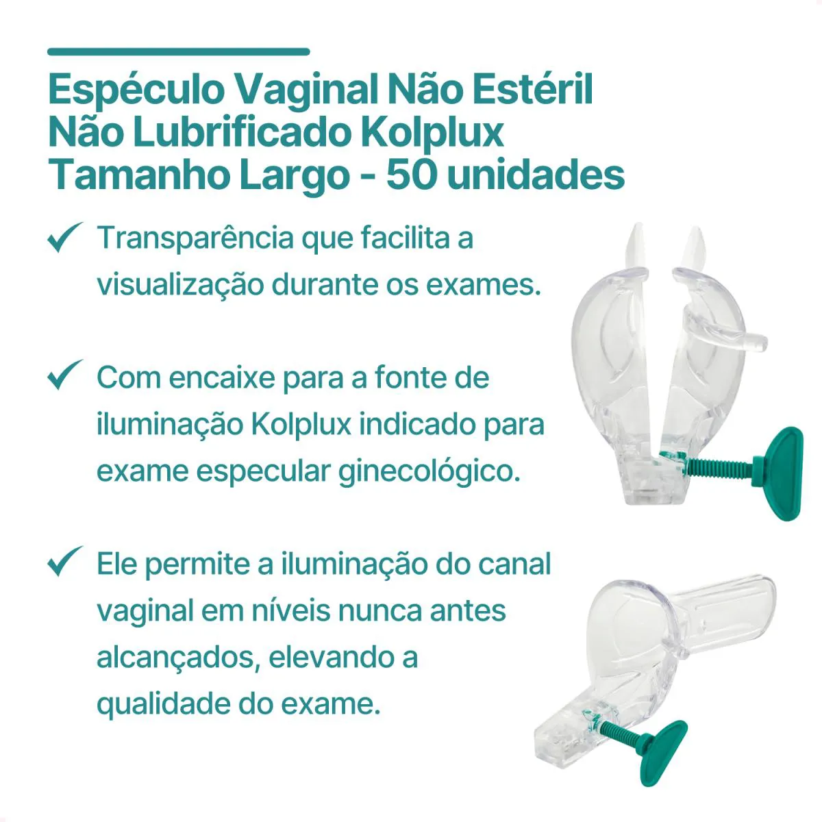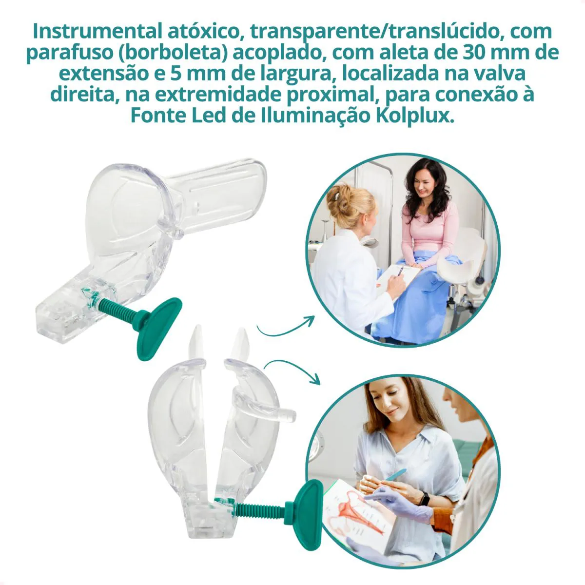 O Espéculo Vaginal descartável com encaixe para a fonte de iluminação Kolplux indicado para exame especular ginecológico, com a finalidade de visualização da cavidade vaginal e colo uterino, Colposcopia, coleta de material biológico para exames e/outros procedimentos específicos destes órgãos ele permite a iluminação do canal vaginal em níveis nunca antes alcançados, elevando a qualidade do exame.